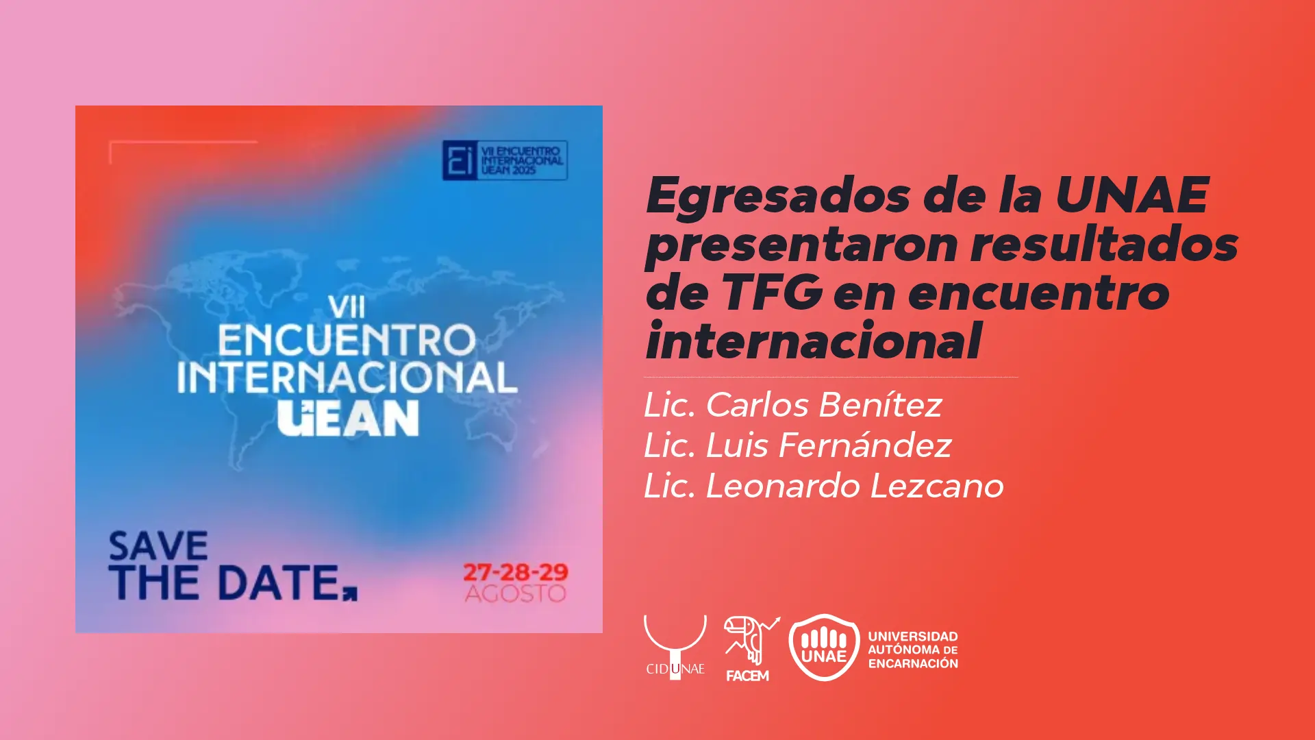 Recientes egresados de la Licenciatura en Administración de Empresas de la Facultad de Ciencias Empresariales (FACEM) de la Universidad Autónoma de Encarnación (UNAE) presentaron los resultados de su Trabajo Final de Grado (TFG), en el marco del VII Encuentro Internacional Universidad Escuela Argentina de Negocios (UEAN).