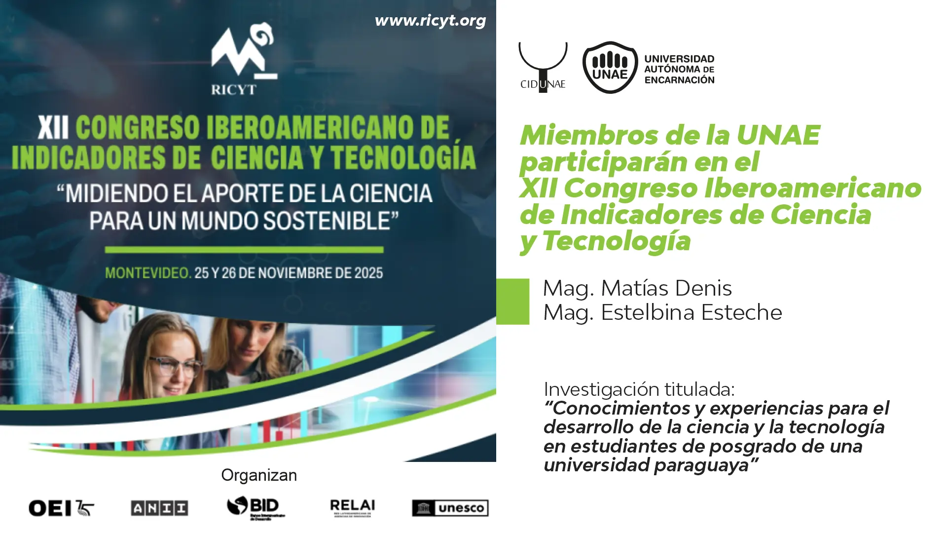 El Mag. Matías Denis, director del CIDUNAE e investigador categorizado del SISNI-CONACYT, y la Mag. Estelbina Esteche, docente de la Facultad de Ciencias Empresariales (FACEM) de la Universidad Autónoma de Encarnación (UNAE) e investigadora categorizada del SISNI-CONACYT, presentarán una investigación en el marco del XII Congreso Iberoamericano de Indicadores de Ciencia y Tecnología, a realizarse los días 25 y 26 de noviembre en Montevideo, Uruguay.