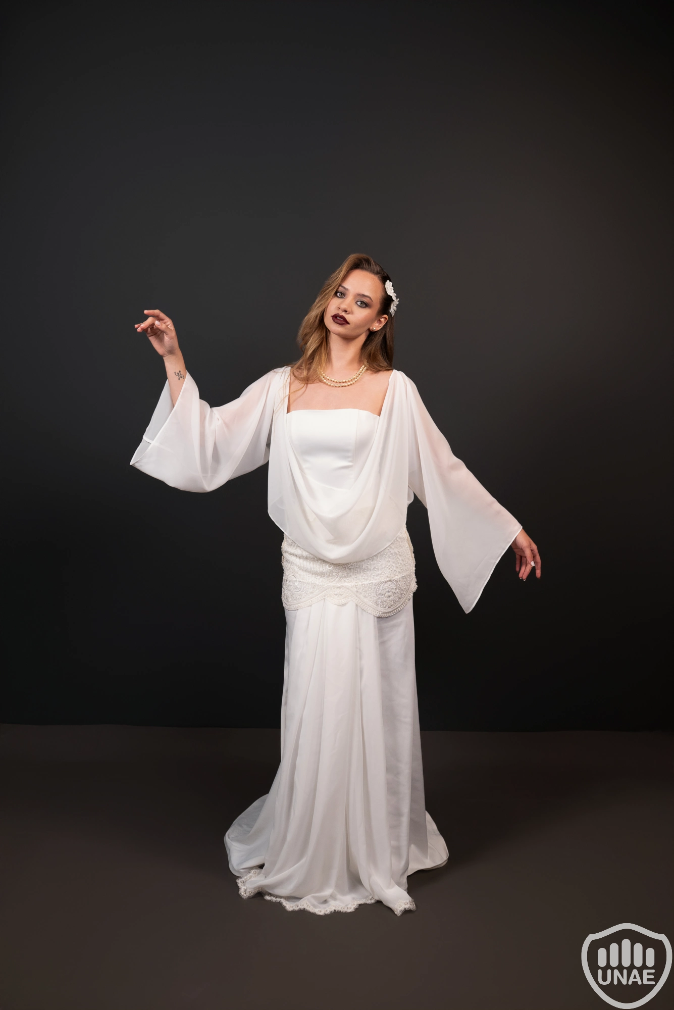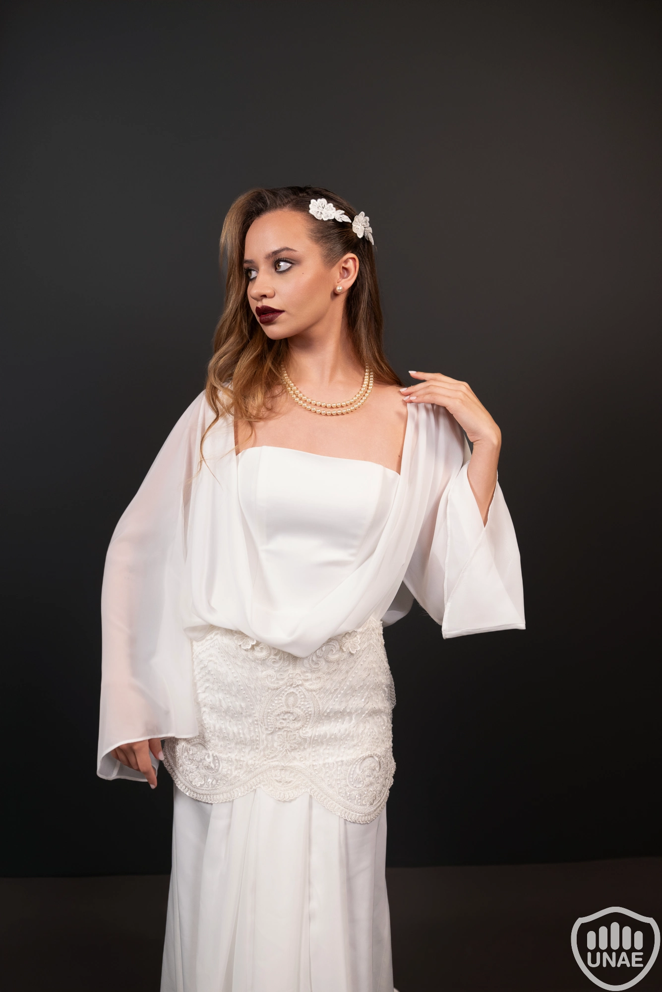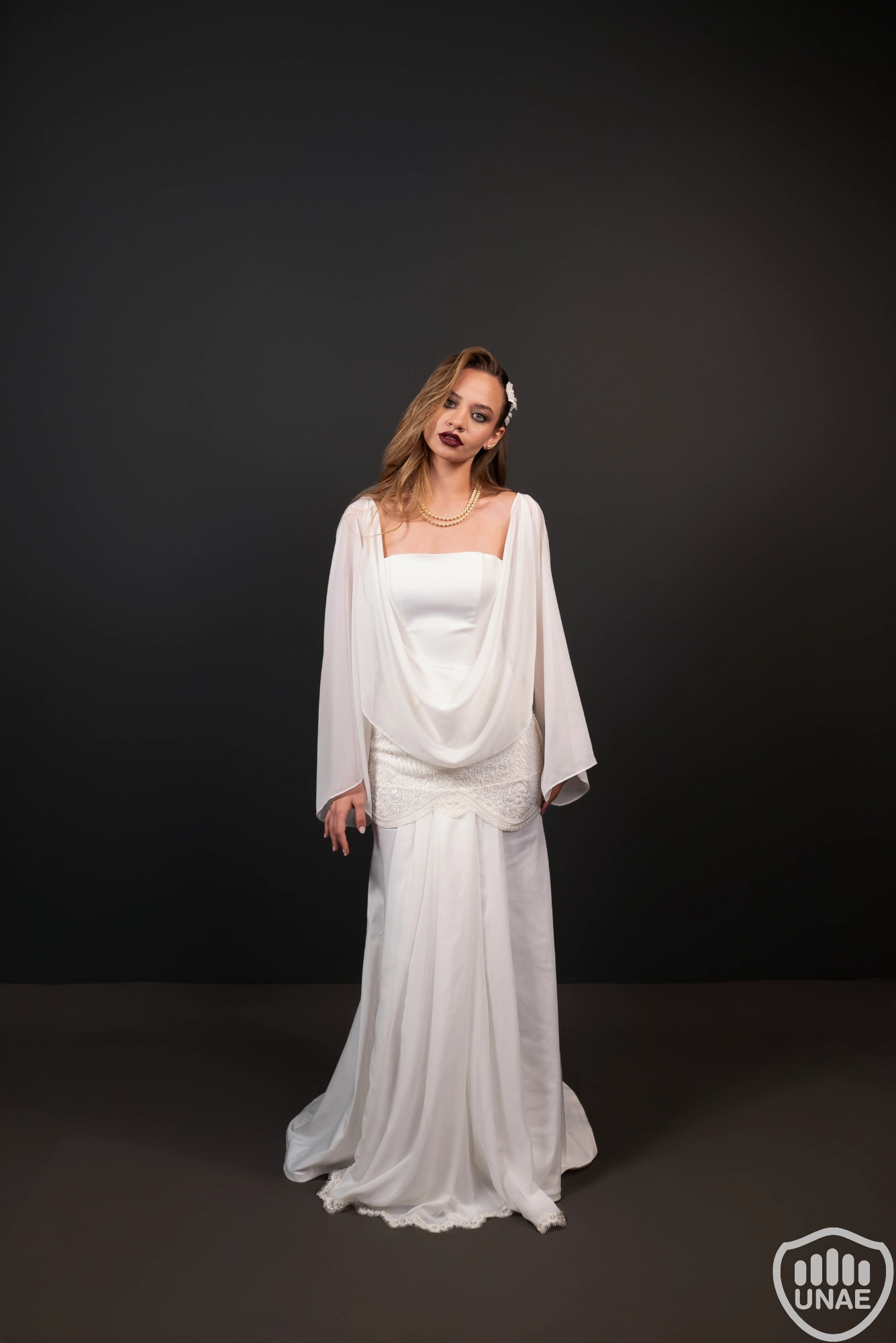 El diseño femenino encarna la presencia etérea de la novia. Se compone de un corsé strapless acompañado por una blusa de gasa natural con cuello volcado y mangas amplias. La falda estilo columna, con cola sweep train, está confeccionada en textil Mandalai en tono blanco champán y presenta en su borde una guarda bordada que retoma el motivo del cinturón. Este cinturón de cadera, elaborado a mano, combina un medallón central con arabescos, líneas de mostacillas en “V” y un borde puntilla con ondas suaves. Desde su centro cae una gasa translúcida que genera una caída fluida y vertical, rematada en tul bordado con perlas, mostacillas y lentejuelas. El conjunto se completa con un velo estilo gorro de tul bordado, finalizando a la altura de la cintura, que refuerza su carácter fantasmal y atemporal.