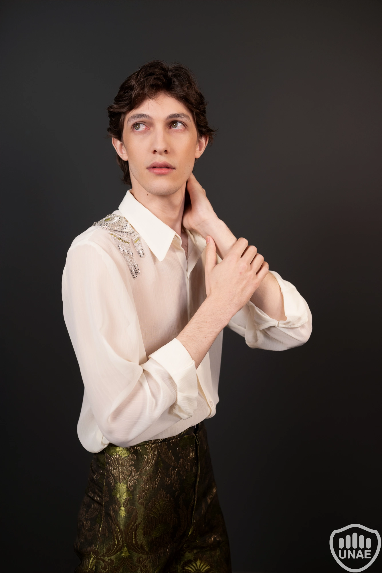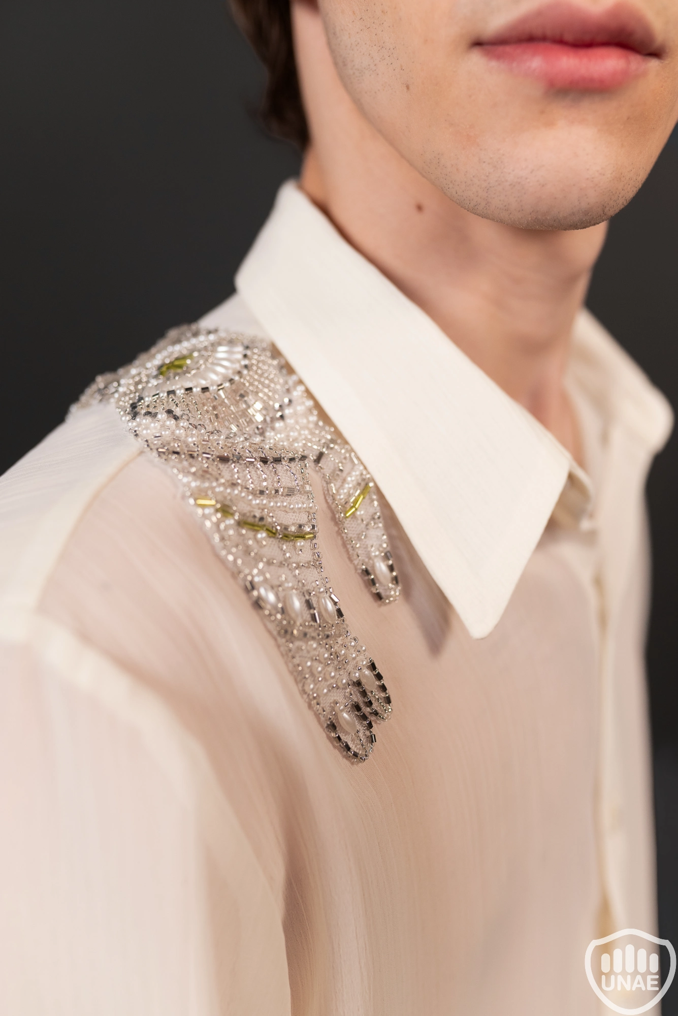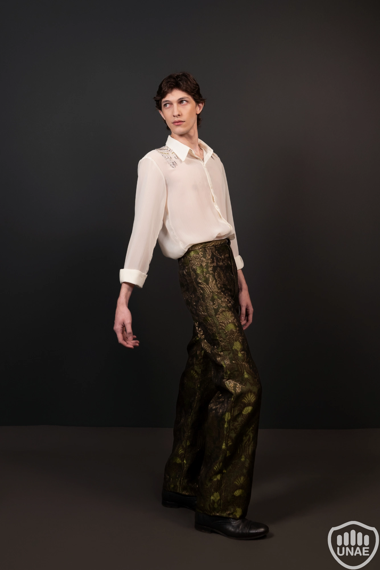 El diseño masculino representa a un hombre moderno atravesado por una ausencia que no logra comprender. No recuerda a su amada ni la vida que compartieron, pero conserva una melancolía persistente y la intuición de que una presencia lo acompaña. Este sentimiento se refleja en un pantalón wide leg de tiro alto, confeccionado en un textil tipo brocado verde oliva con reflejos dorado envejecido, que aporta profundidad y una estética atemporal. La camisa holgada de gasa semitranslúcida incorpora el simbolismo principal: manos bordadas en perlas y canutillos en tonos blancos, transparentes, verdes y negros —este último como símbolo de la muerte—, de cuyas muñecas descienden collares de perlas hacia la espalda, representando el lazo espiritual de su amada. Completa el conjunto un antifaz de gasa negra bordada, metáfora del luto sin memoria y del amor que siente sin recordar.