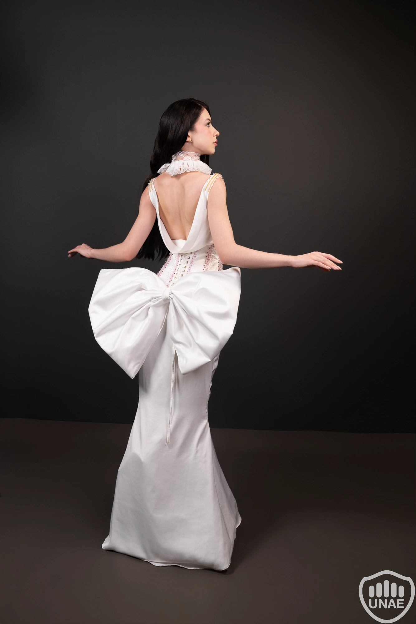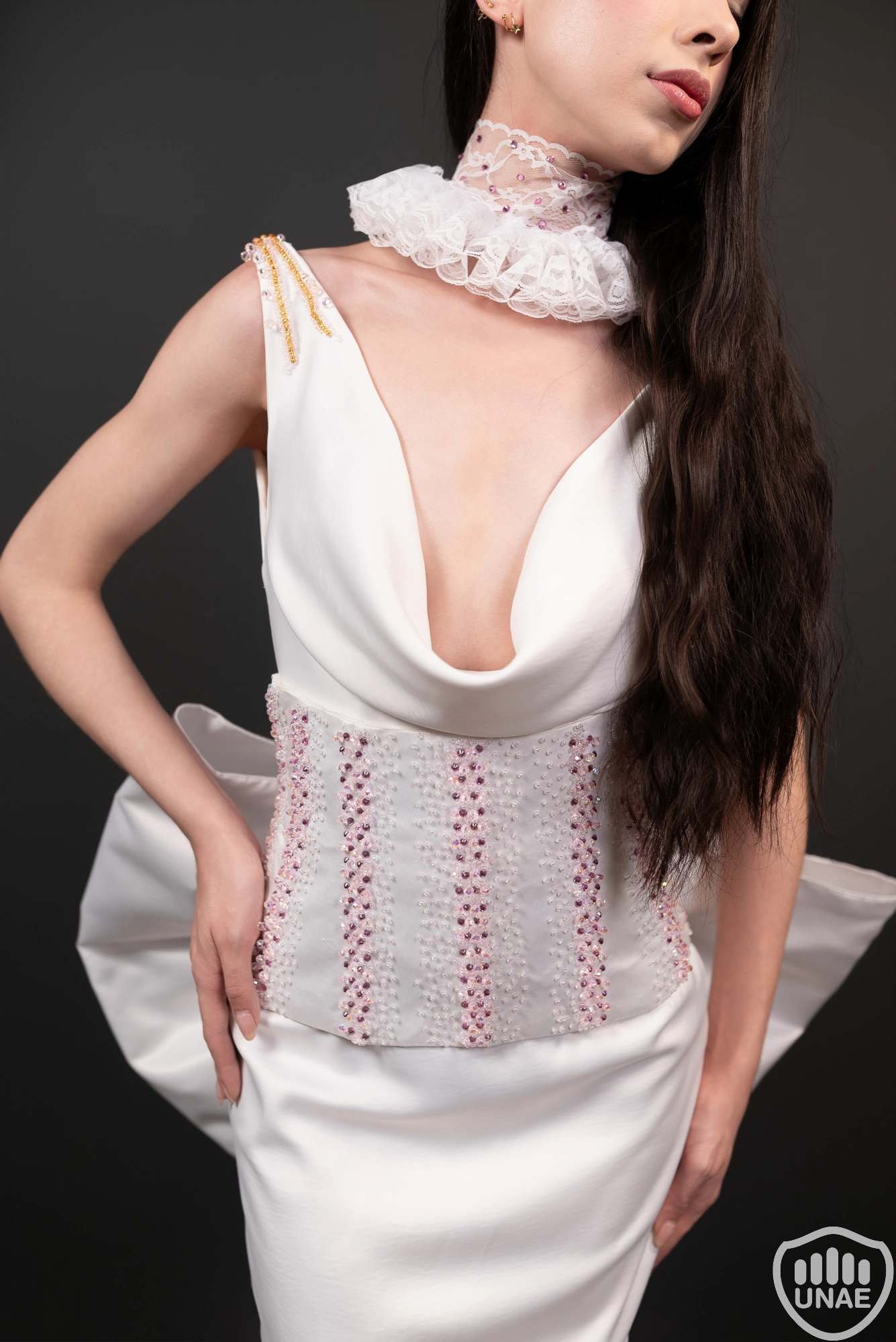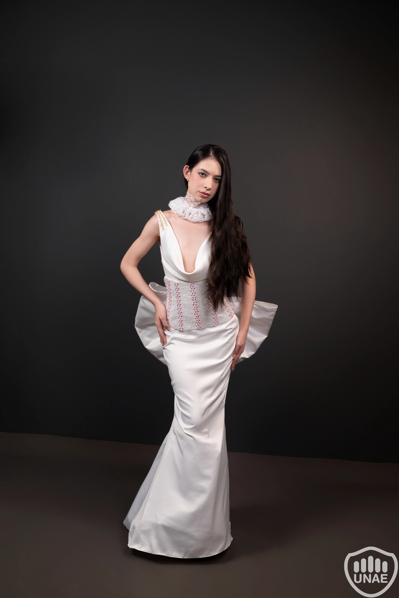 El diseño femenino, inspirado en Colombina, expresa sensualidad, belleza y libertad. El vestido de satén blanco con caída en el cuello y la espalda revela elegancia y movimiento, adornado con bordados rosados y dorados que representan deseo y sofisticación. Un corset con los mismos detalles, junto a un moño estructurado con intervención textil inspirada en el Palacio Ducal, acentúan su encanto seductor. La máscara blanca con velo transparente completa su aire de misterio y poder.