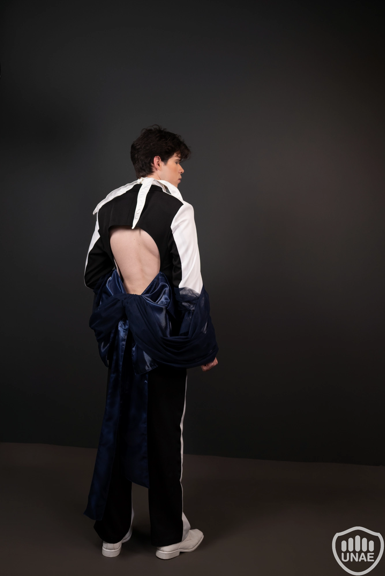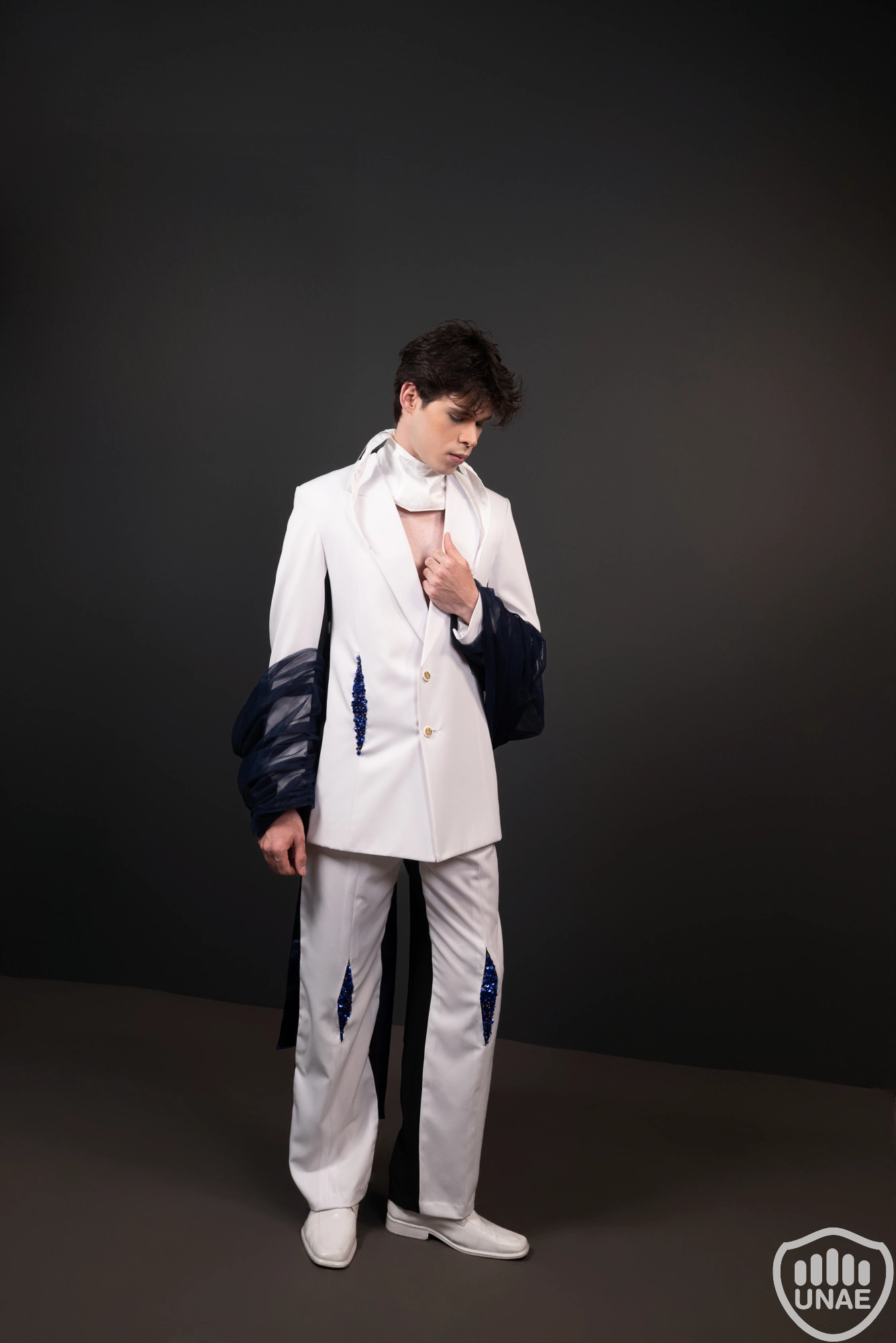 El diseño masculino, inspirado en Pierrot, refleja la melancolía del amor no correspondido mediante el contraste entre el blanco y el negro, simbolizando la lucha entre la pureza y la oscuridad interior. Los bordados en tonos azules y dorados evocan tristeza y nobleza, mientras un moño azul cubierto por una tela negra transparente cae desde la espalda, sugiriendo la sensación de estar atrapado en sus sentimientos. Su presencia encarna la vulnerabilidad y la profundidad emocional.