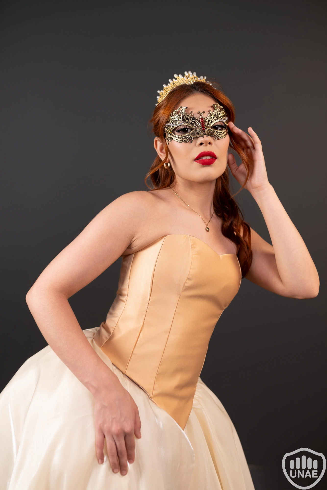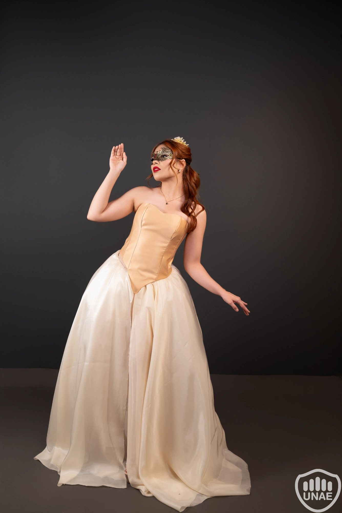 La pieza presentada es una creación de alta costura que fusiona la majestuosidad isabelina con el misterio teatral del Carnaval Veneciano. El diseño parte de un corset estructurado en tono champagne, confeccionado en satén ceñido y de líneas limpias que aportan una silueta firme, regia y poderosa. Esta base corsetera evoca la elegancia severa de la Reina Isabel I, reinterpretada desde una estética moderna y más sensual.