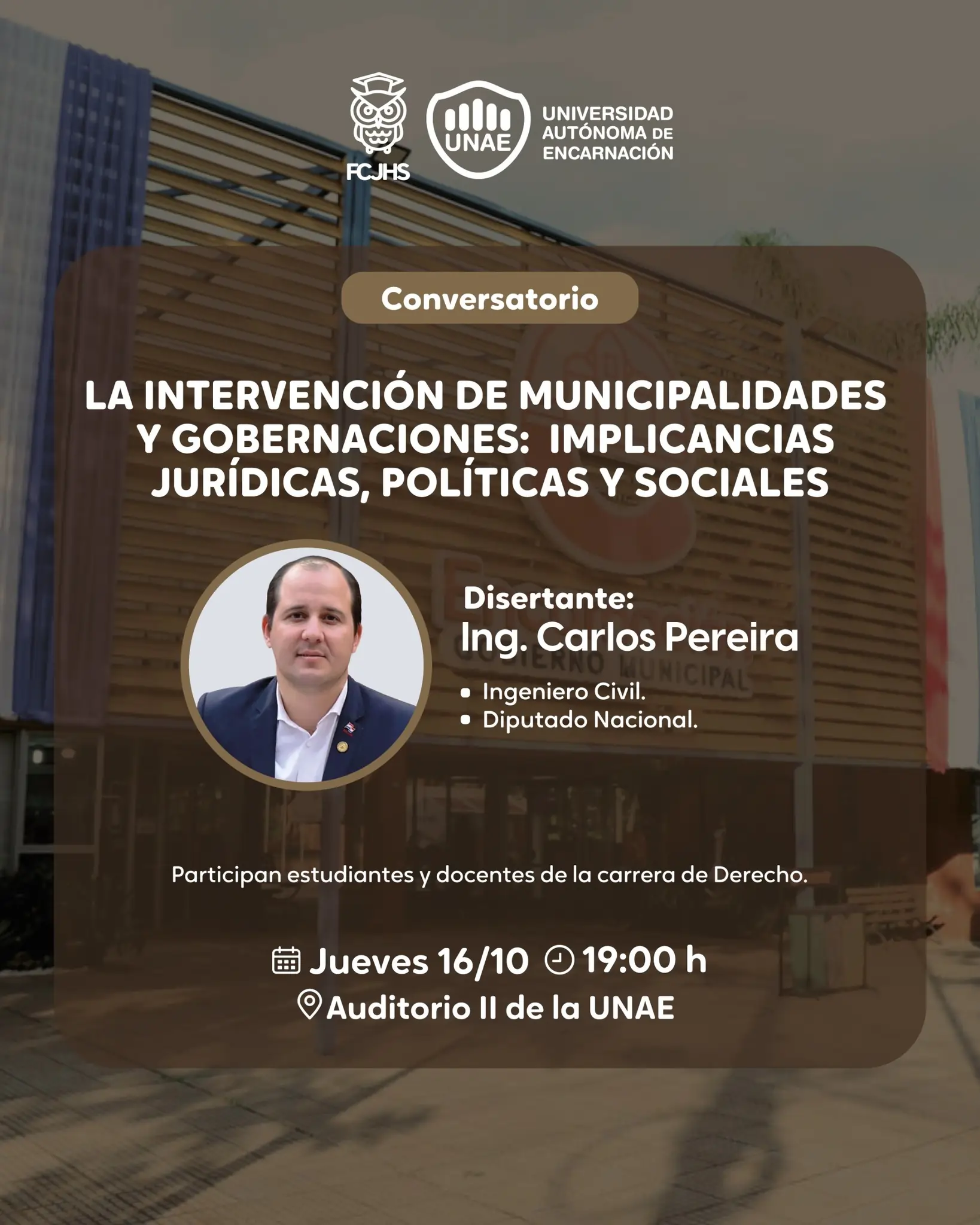 La Universidad Autónoma de Encarnación - UNAE invita a estudiantes y docentes de la carrera de Derecho a participar del Conversatorio "La intervención de municipalidades y gobernaciones: Implicancias jurídicas, políticas y sociales"