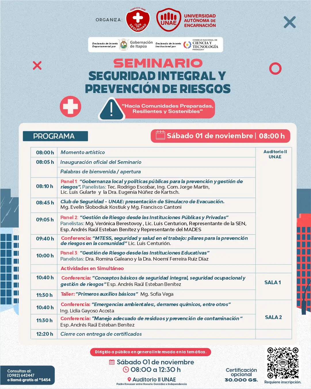 El seminario contará con la participación de 16 destacados disertantes nacionales e internacionales, entre ellos expertos de Paraguay y Argentina, quienes abordarán temas vinculados a la gestión de riesgos, seguridad ocupacional, liderazgo preventivo y planificación institucional ante emergencias.