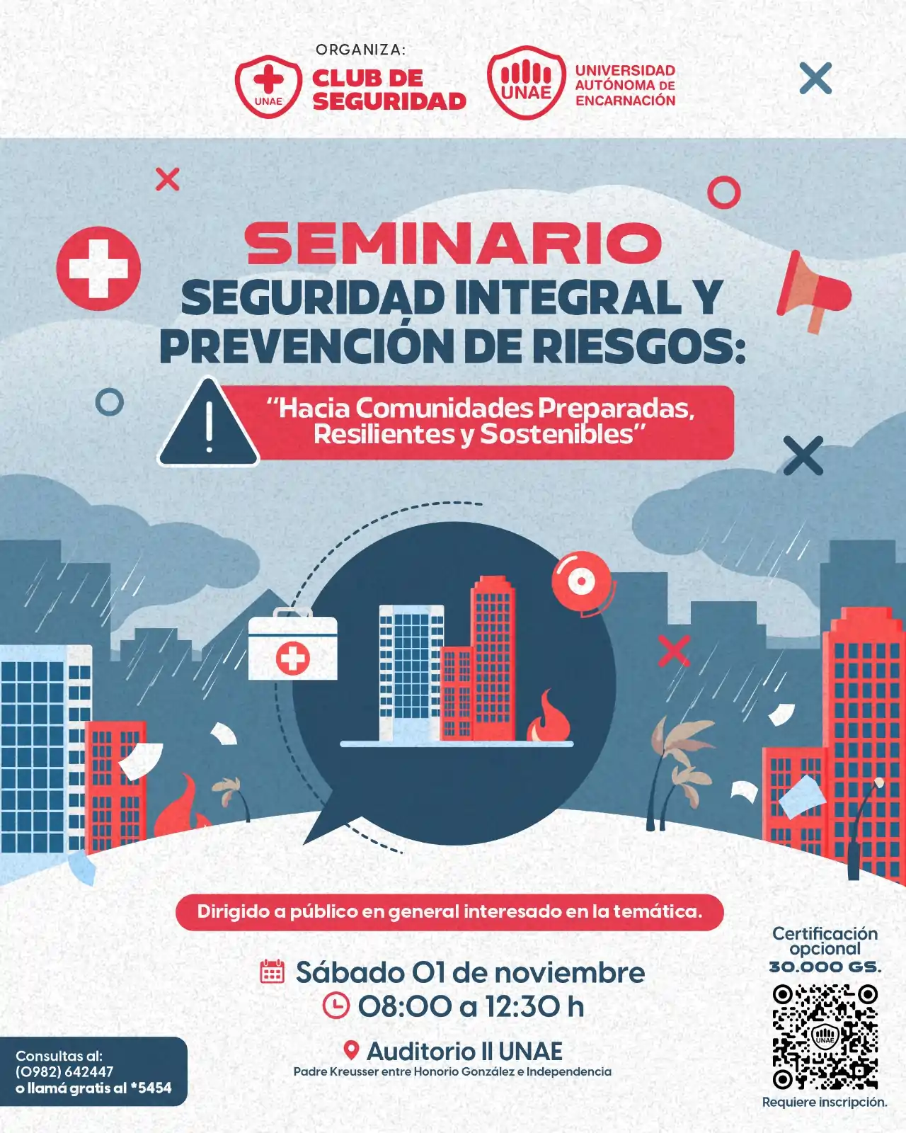 El Club de Seguridad de la Universidad Autónoma de Encarnación (UNAE), invita a participar del Seminario Seguridad integral y prevención de riesgos "Hacia comunidades preparadas, resilientes y sostenibles"