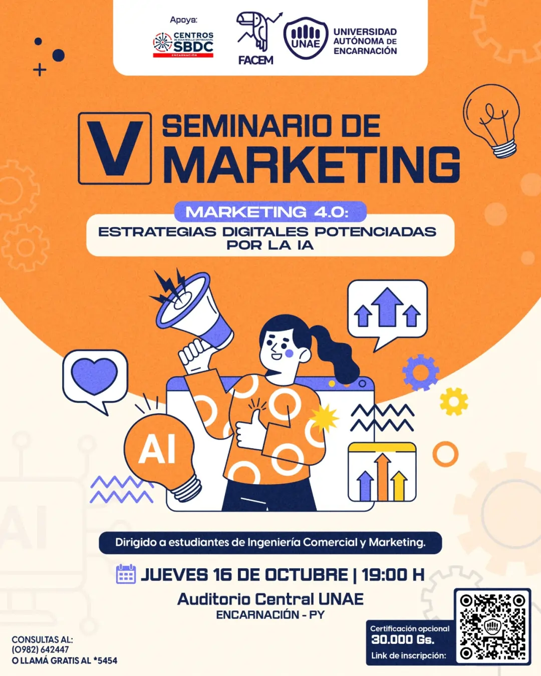 La Facultad de Ciencias Empresariales - FACEM y la Universidad Autónoma de Encarnación - UNAE, invitan al V Seminario de Marketing: 🚀 Marketing 4.0: Estrategias digitales potenciadas por la Inteligencia Artificial