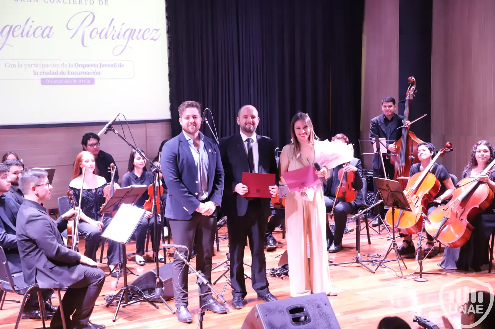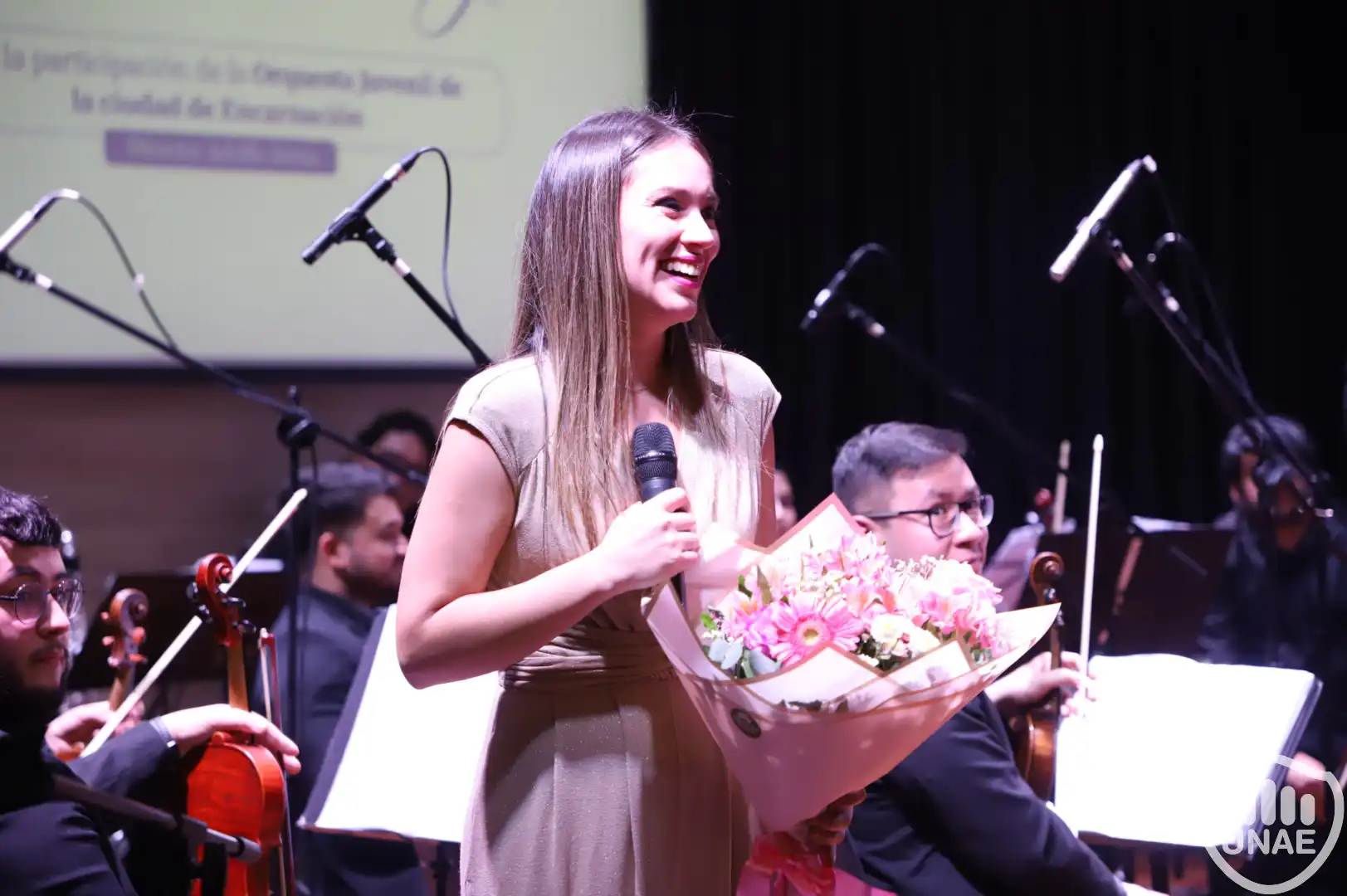 El concierto incluyó un repertorio interpretado tanto en formato solista, donde la artista desplegó su sensibilidad y calidad interpretativa, como también obras ejecutadas junto a la Orquesta Juvenil de la Ciudad de Encarnación, bajo la dirección del Maestro Adolfo Arrúa, generando un diálogo musical que enriqueció la propuesta artística y emocionó al público presente.