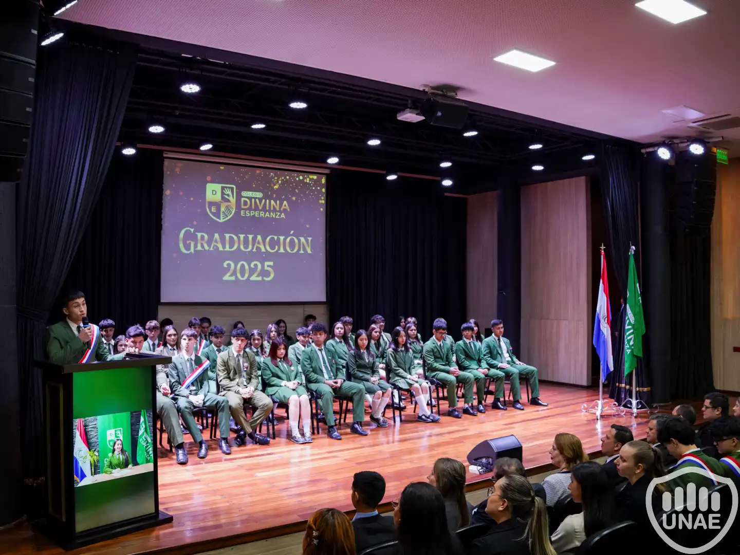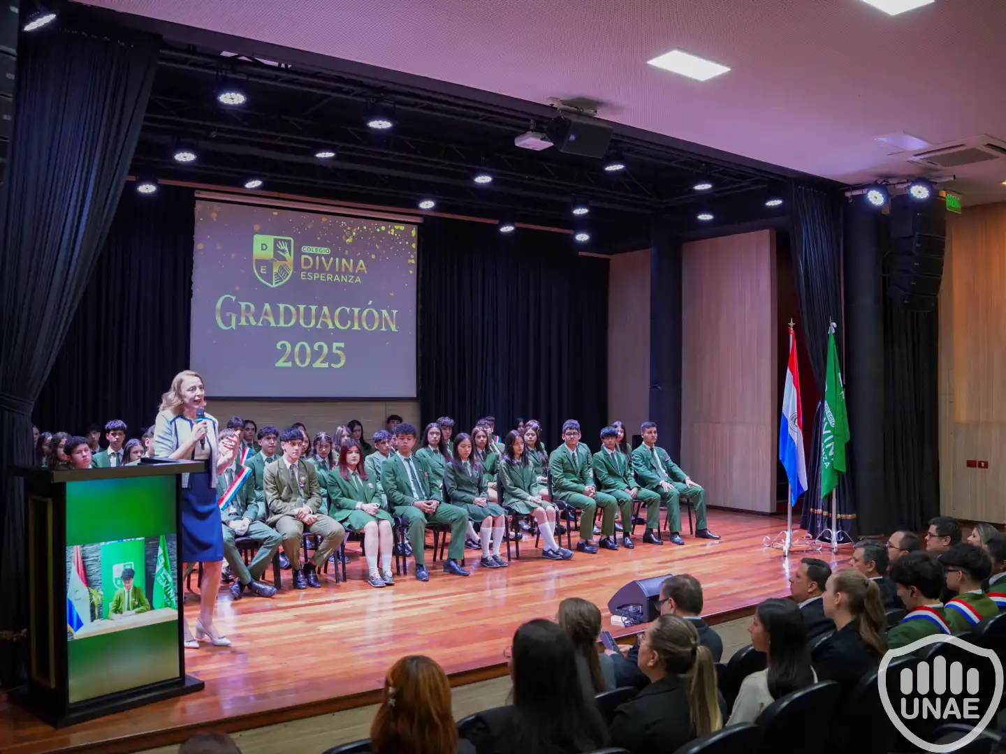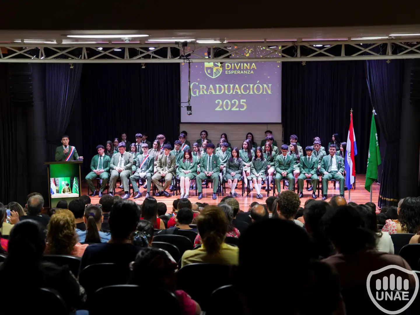 El Colegio Privado Divina Esperanza, perteneciente al Complejo Educativo UNAE, llevó a cabo el Acto Solemne de Graduación de la Promoción Nacional 2025, denominado “Sesquicentenario de la Epopeya Nacional: 1864–1870. Escolástica Barrios de Gill – Homenaje al Centenario de la Guarania”, en el Auditorio Central de la Universidad Autónoma de Encarnación (UNAE).