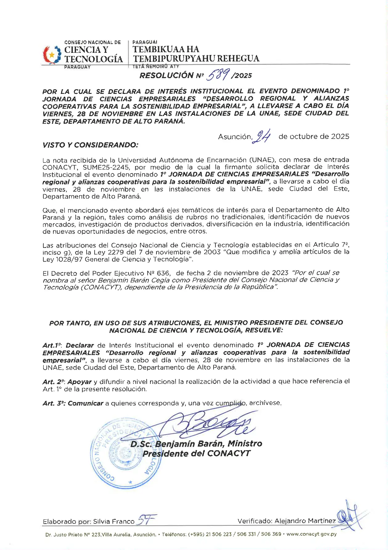 La 1ª Jornada de Ciencias Empresariales “Desarrollo regional y alianzas cooperativas para la sostenibilidad empresarial” de la UNAE sede Ciudad del Este, ha sido declarada de Interés Institucional por el Consejo Nacional de Ciencia y Tecnología - CONACYT por Res. N° 589/2025.