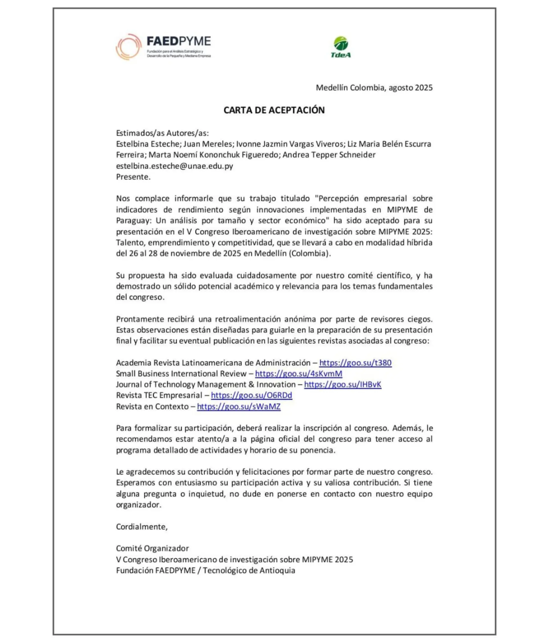 Miembros de la Universidad Autónoma de Encarnación (UNAE) presentarán los resultados de una investigación en el marco del V Congreso Iberoamericano de investigación sobre MIPYME 2025: Talento, emprendimiento y competitividad, que se realizará en el Tecnológico de Antioquia (TdeA) – Medellín, Colombia durante los días 26 – 27 y 28 de noviembre de 2025.