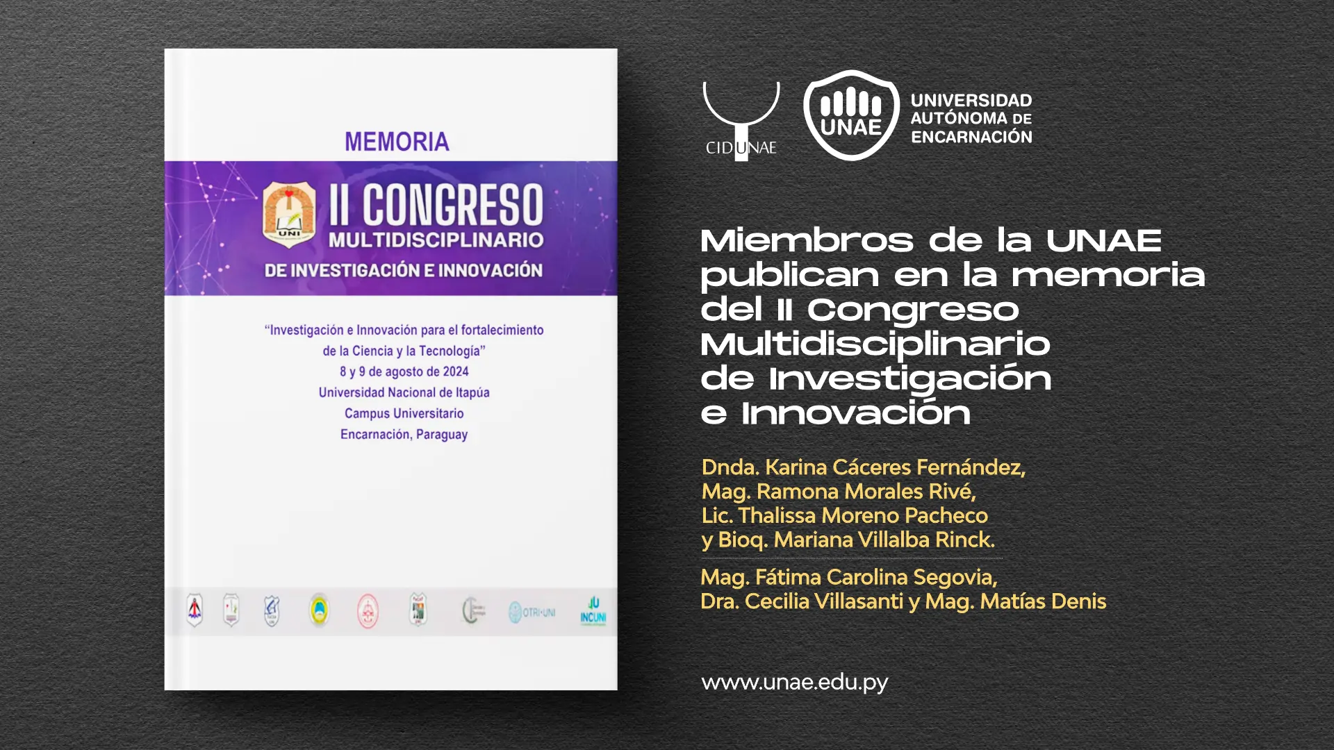 Miembros de la Universidad Autónoma de Encarnación (UNAE) participaron en el II Congreso Multidisciplinario de Investigación e Innovación “Investigación e Innovación para el fortalecimiento de la Ciencia y la Tecnología”, organizado por la Universidad Nacional de Itapúa (UNI) los días 8 y 9 de agosto de 2024, publicando resúmenes de sus investigaciones en la memoria del evento.