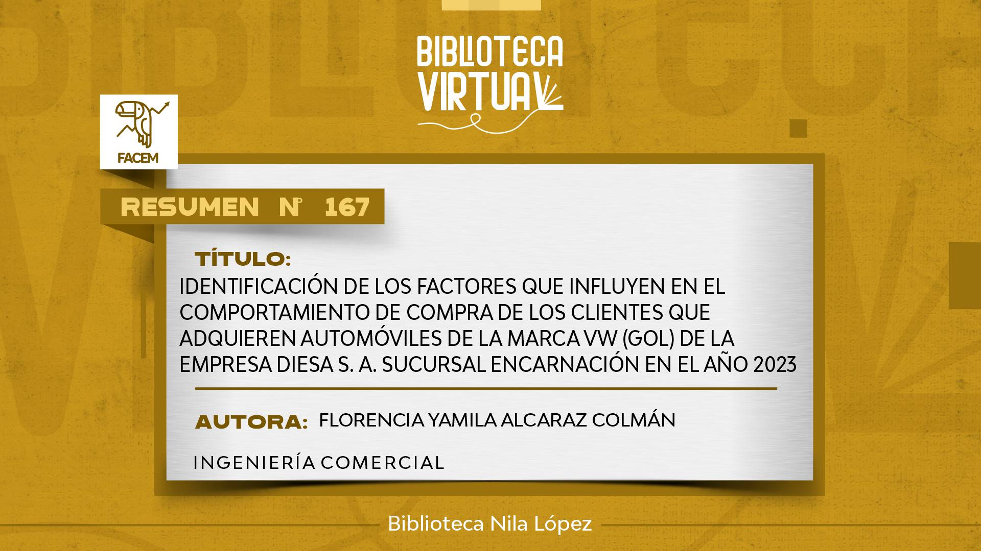 La investigación titulada “Identificación de los factores que influyen en el comportamiento de compra de los clientes que adquieren automóviles de la marca VW (Gol) de la empresa Diesa S.A. sucursal Encarnación en el año 2023” tuvo como objetivo identificar los factores que influyen en el comportamiento de compra de los clientes que adquieren automóviles de la marca VW (Gol) de la empresa Diesa S.A. sucursal Encarnación durante el primer trimestre del año 2023. Para el análisis metodológico, la investigación tuvo un enfoque cuantitativo, con finalidad proyectiva y tipología descriptiva, caracterizándose por poseer una temporalidad transversal. Teniendo en cuenta que los datos tomados para la evaluación fueron obtenidos a través de fuentes primarias de investigación, la naturaleza de estudio fue de campo. En cuanto al procedimiento de recolección de datos, se implementó la técnica de muestreo de tipo no probabilístico intencional, utilizando para el efecto un cuestionario de 19 preguntas cerradas que atravesó por un proceso previo de validación a cargo del plantel docente de la universidad, posteriormente, la encuesta fue difundida y aplicada específicamente al segmento de clientes que adquirieron vehículos de la marca VW (Gol) en el período mencionado. Como resultado del trabajo de campo, se evidenció que el consumidor actual posee una mayor sensibilidad a los factores que influyen en su decisión de compra, los cuales son categorizados teniendo en cuenta el entorno social del individuo y aquellos aspectos referentes al producto comercializado por la empresa. Con los resultados estadísticos fue posible identificar que la empresa posee una cartera de clientes conformada mayoritariamente por personas de sexo masculino, esto puede ser justificado teniendo en cuenta aquellos factores relacionados con la edad, los gustos, las preferencias, la utilidad brindada al vehículo, entre otros aspectos. En lo referente al proceso de compra, el cliente que adquiere automóviles de la marca VW (Gol) afirma que los factores que poseen un mayor grado de influencia para tomar la decisión final de adquisición son el precio, la seguridad, la garantía, el ingreso promedio y el servicio post venta, por otra parte, teniendo en cuenta el entorno social del individuo, los grupos de mayor incidencia son la familia y los amigos, a su vez, se atribuye otro aspecto importante correspondiente a la utilidad brindada al vehículo, la cual varía de acuerdo a la franja etaria del segmento analizado. Para establecer el contacto directo con los clientes, la planilla de base de datos otorgada por el departamento gerencial de la empresa consistió en la herramienta clave que posibilitó la comunicación bidireccional, en contrapartida, la principal limitación presentada fue el reducido nivel de participación por parte del grupo de clientes encuestados. Finalmente, se identificó que el cliente refleja un alto grado de satisfacción sobre el producto, el servicio y la experiencia de compra brindada por la empresa Diesa S.A. sucursal Encarnación.