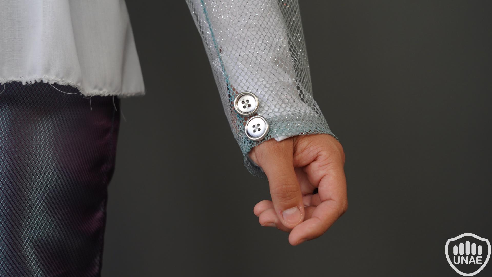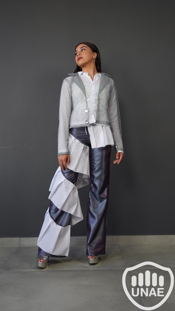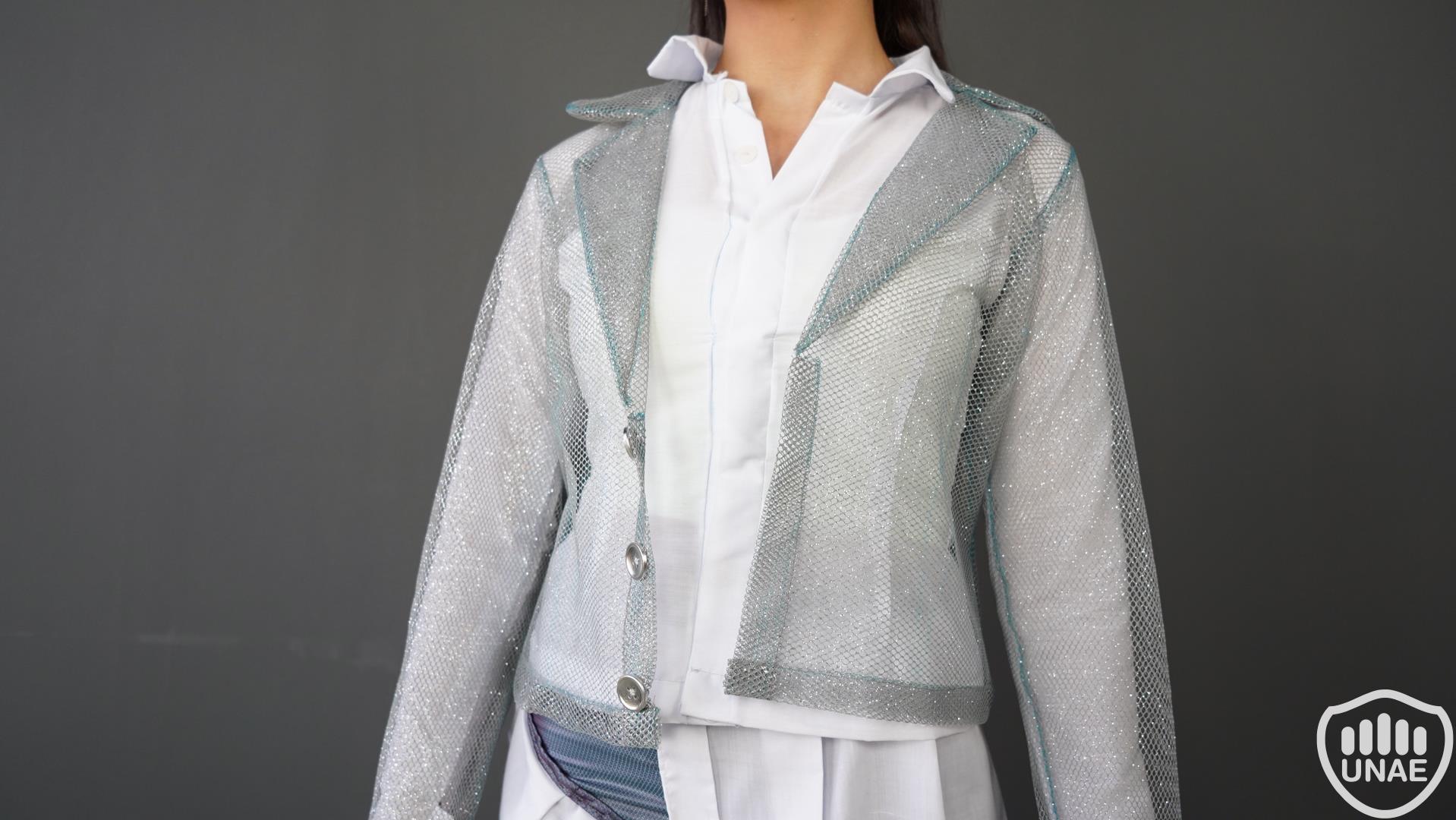 El saco presenta un tejido de ret plateado brillante con un cierre de botón central, mientras que la manga tiene 16 cm con un cierre de botón. La blusa está confeccionada con tejido popelín blanco, tiene botones y una manga de 16 cm con cierre de botón. El pantalón Oxford, de textil sastre azul ashlel, cuenta con un cierre.