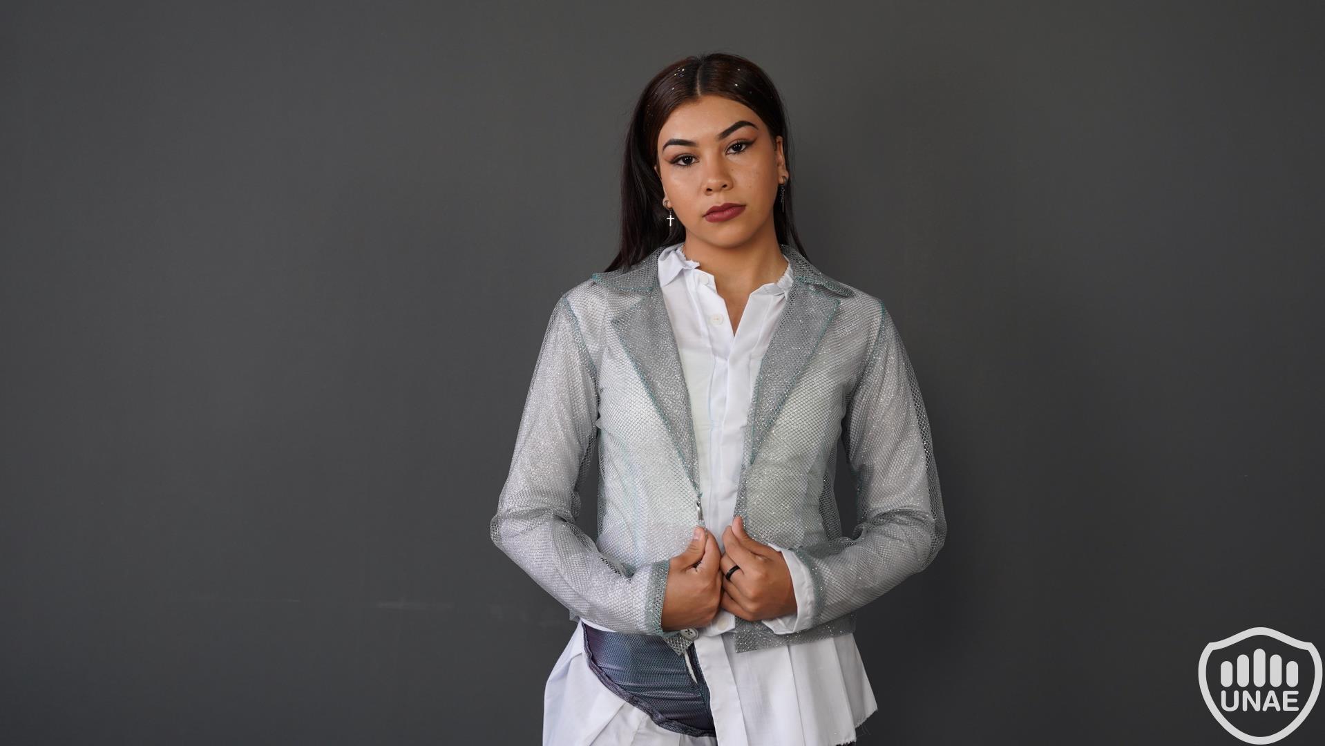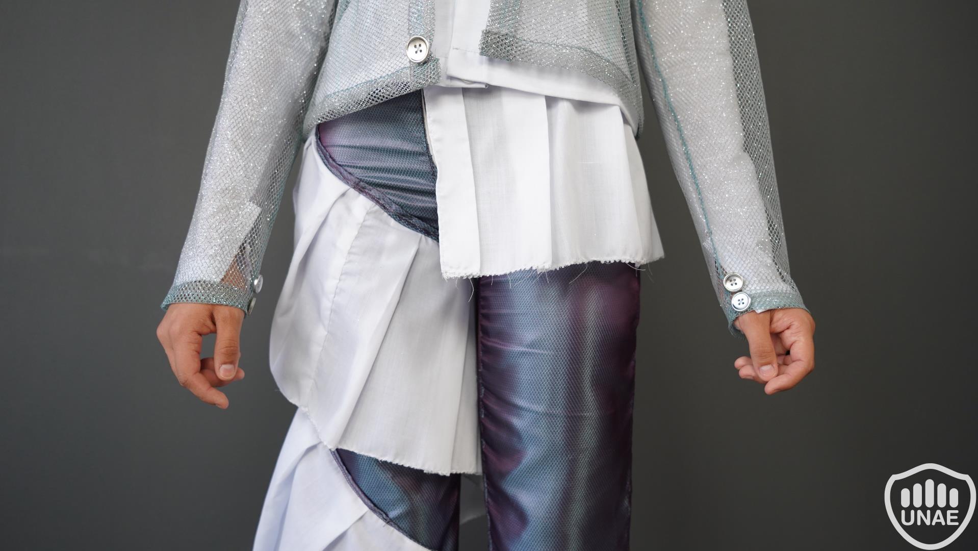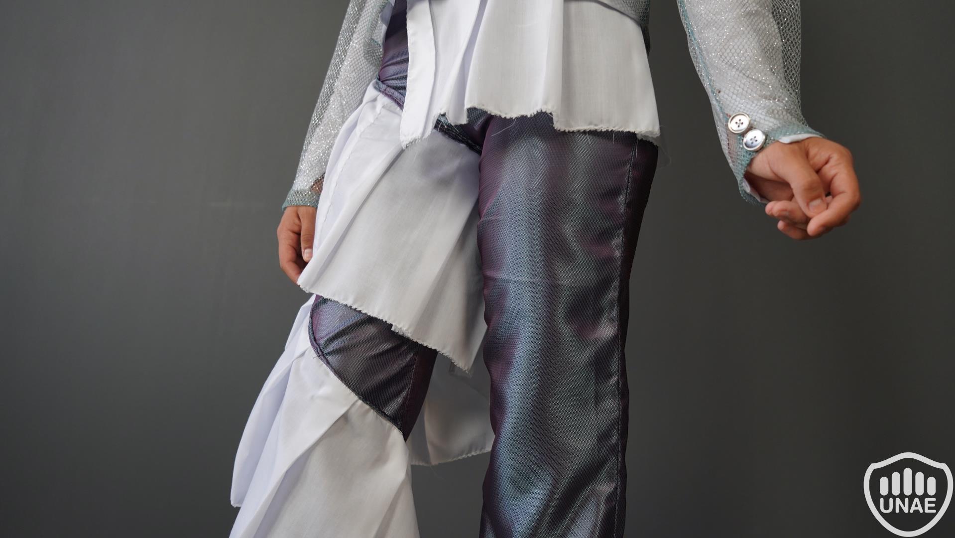 El saco presenta un tejido de ret plateado brillante con un cierre de botón central, mientras que la manga tiene 16 cm con un cierre de botón. La blusa está confeccionada con tejido popelín blanco, tiene botones y una manga de 16 cm con cierre de botón. El pantalón Oxford, de textil sastre azul ashlel, cuenta con un cierre.