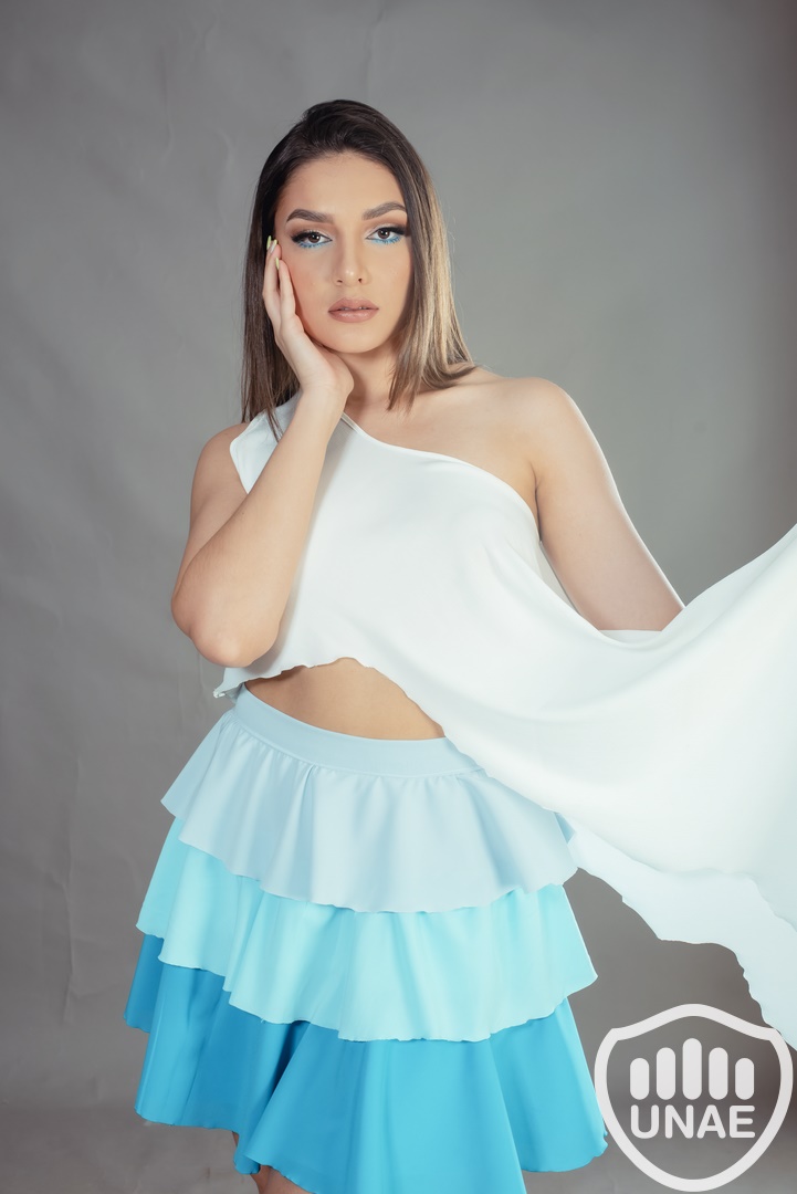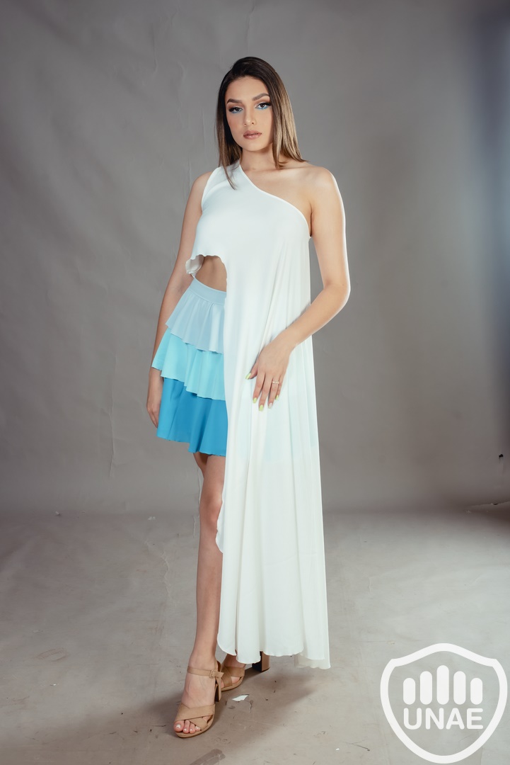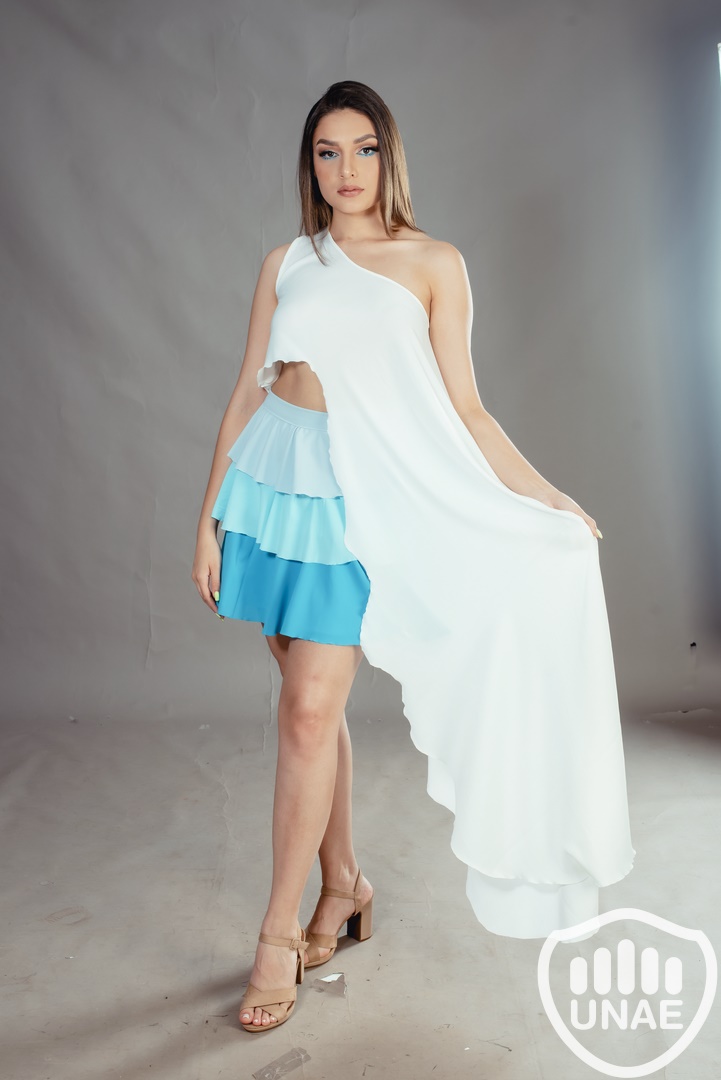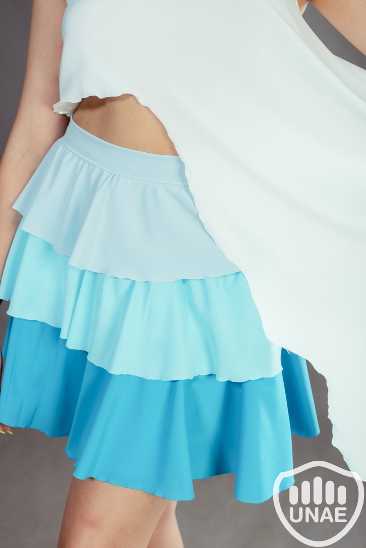 Combinada con una falda que abraza los tonos celestes en volados, esta prenda completa la historia del mar en su máximo esplendor. Los volados en capas, sutilmente graduados en tonos celestes, recuerdan la transición de los azules más claros a los tonos profundos y misteriosos del océano. La falda se mueve con gracia, capturando la grácil movilidad fluida de las olas, aportando una elegancia dinámica que refleja la majestuosidad y la belleza del mar, resaltando cómo la inteligencia artificial se incorpora sutilmente en el proceso creativo y la elaboración de la prenda