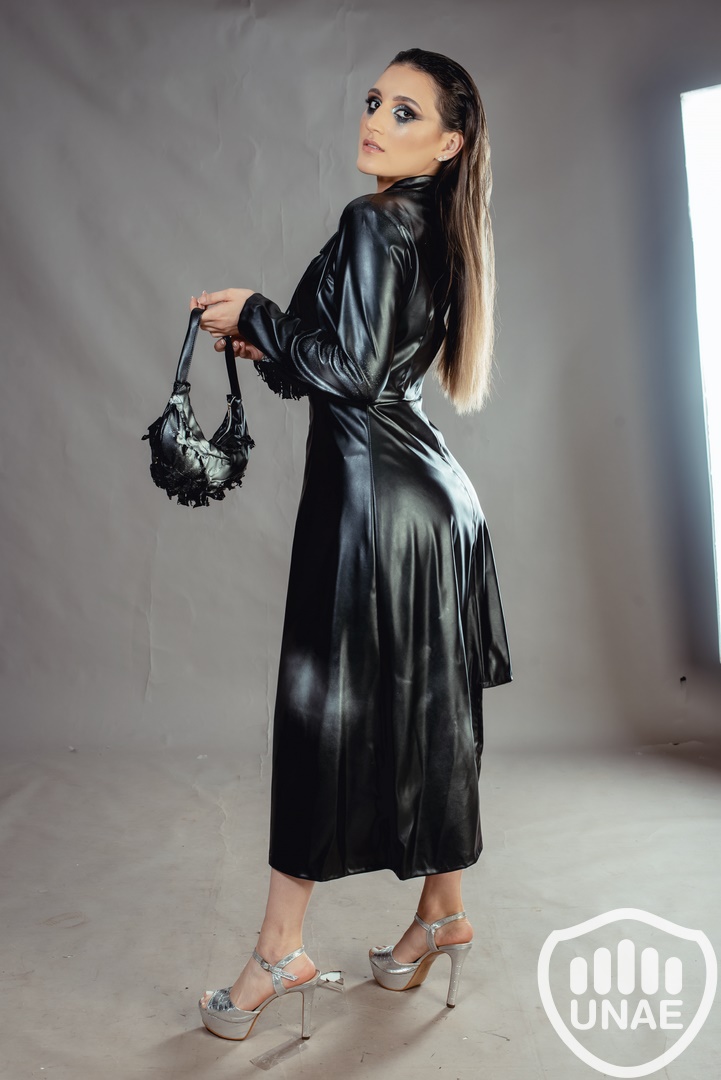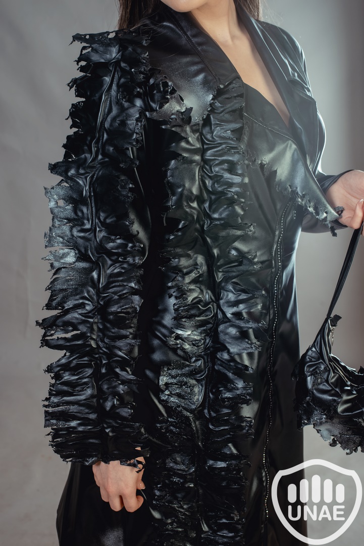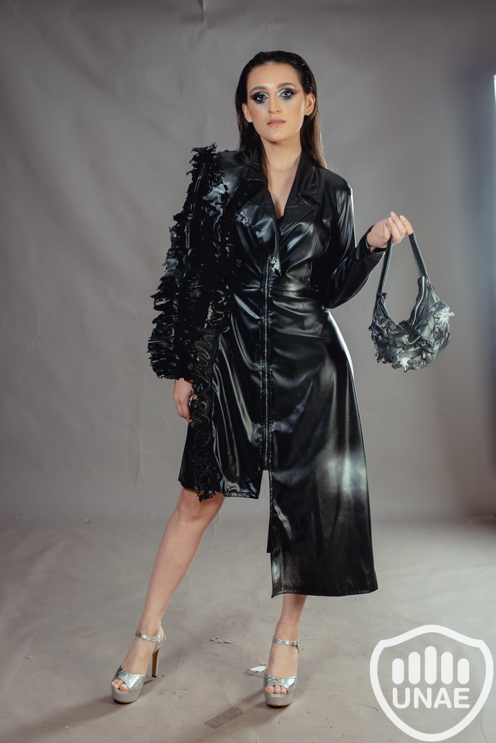 La prenda fusiona la estética futurista con elementos asimétricos, reflejando la influencia de la Inteligencia Artificial y el avance tecnológico en la moda. Su diseño vanguardista simboliza la creciente presencia de la IA y la tecnología en los próximos años, destacando la fusión de estilo y progreso tecnológico.