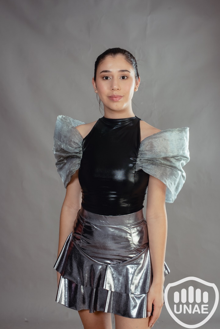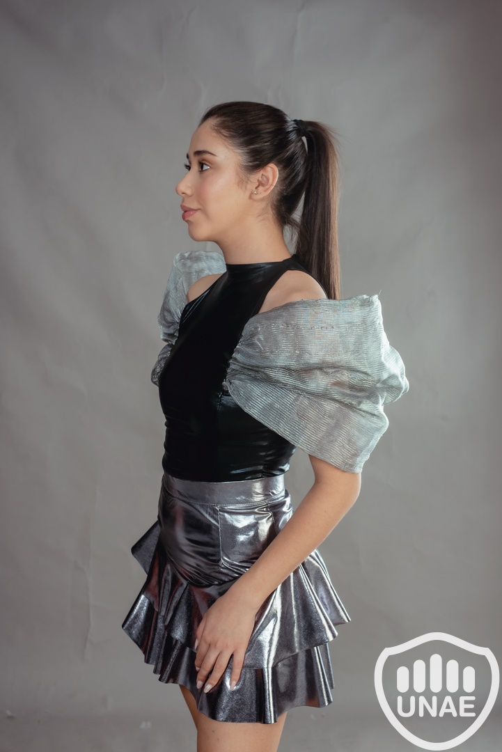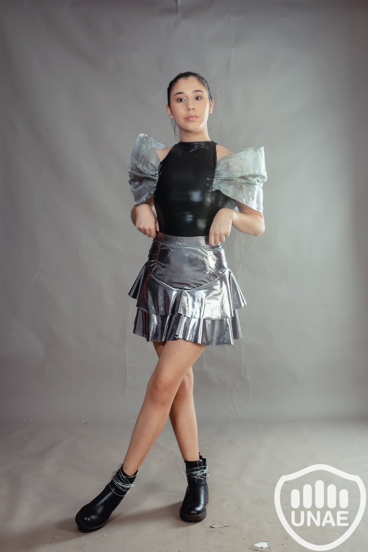 Inspirado en la moda futurista y con un estilo casual formal, tema tomado de referencia utilizando la IA ChatGP, el plateado metálico de este diseño captura la esencia del futuro y la sostenibilidad reutilizando textiles en desuso. El diseño consta de dos piezas, en la parte superior con un body de lame en tono negro metalizado, con ganchos para mejor ajuste y comodidad a la hora de vestir, destacado por pinzas Dior que resalta la silueta femenina X, tanto en el delantero como en la espalda donde se superpone una estructura en forma de manga voluminosa asimétrica con la participación del tejido de boal en tonos grises, trabajado con alambre de forma horizontal. En la parte inferior se utilizó el tono gris metálico en una falda base con pinzas, haciendo protagonista al volado desde la segunda cadera utilizando el corte caracol que crea un sutil movimiento al caminar. Diseñado para mujeres de 20 a 30 años apasionadas de la moda, la elegancia, lo funcional y vanguardista.
