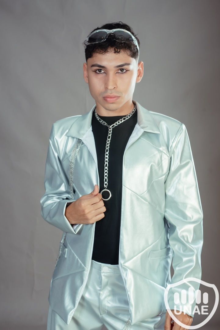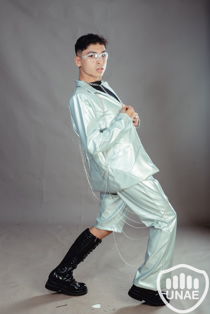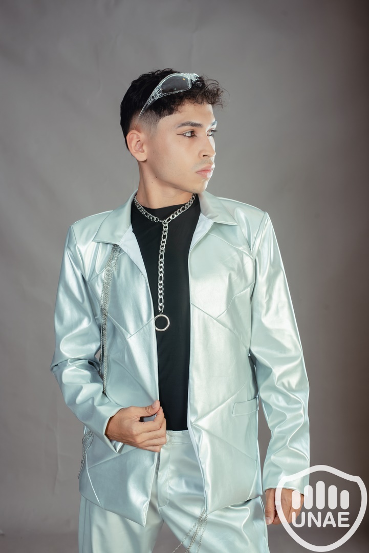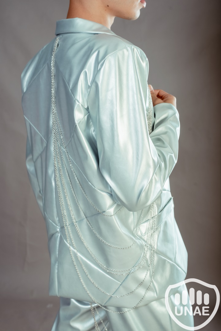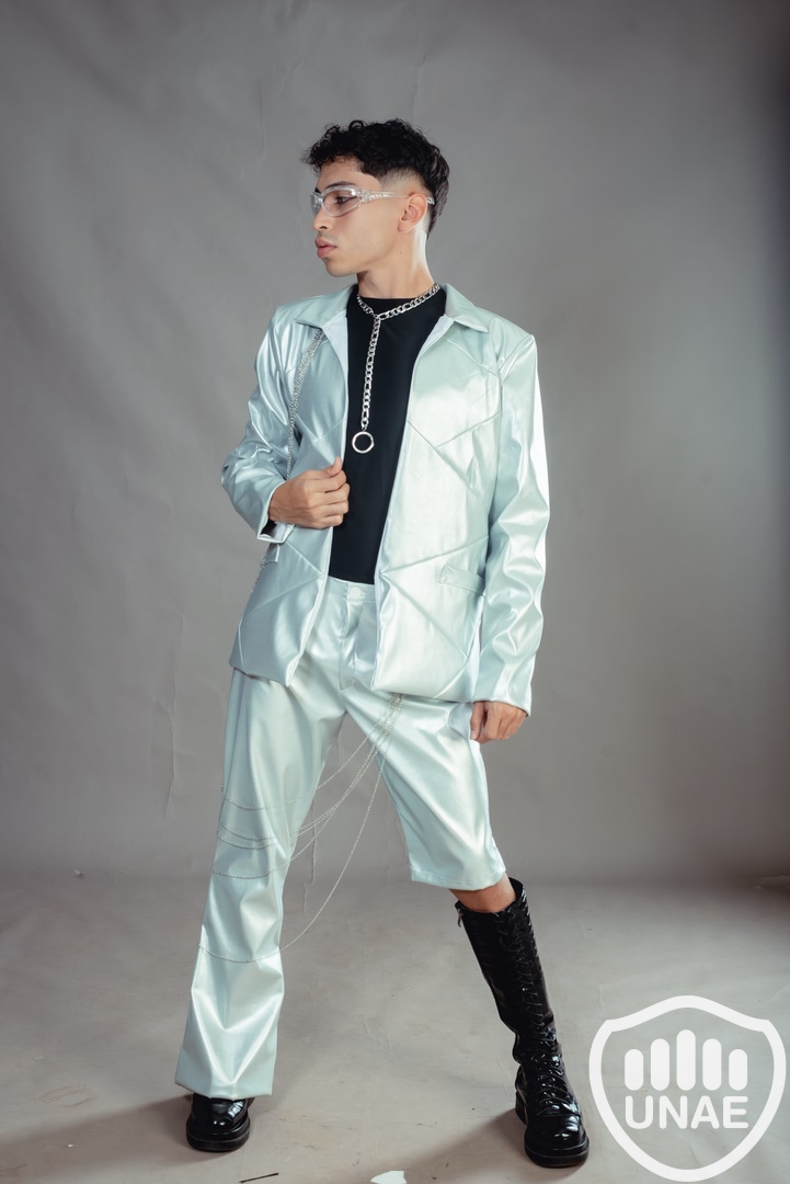 Diseño de indumentaria inspirado en "inteligencia artificial" fusiona elementos futuristas con un toque de rebeldía. La elección del eco cuero metálico sugiere innovación y modernidad, mientras que la inclusión de cadenas aporta un elemento vanguardista y un guiño al aspecto tecnológico. La combinación de estos elementos crea una prenda que refleja una estética audaz y a la vez conectada con la evolución tecnológica.