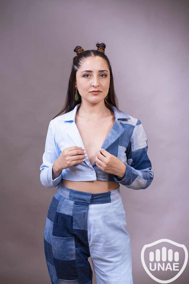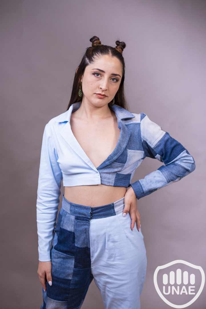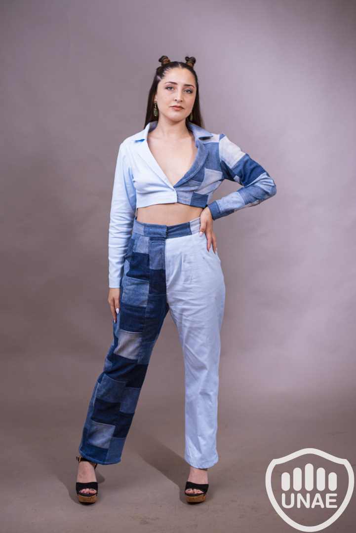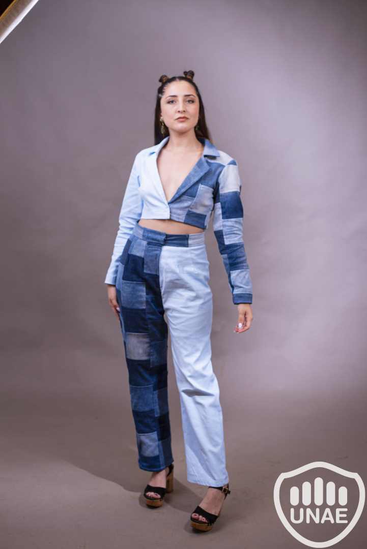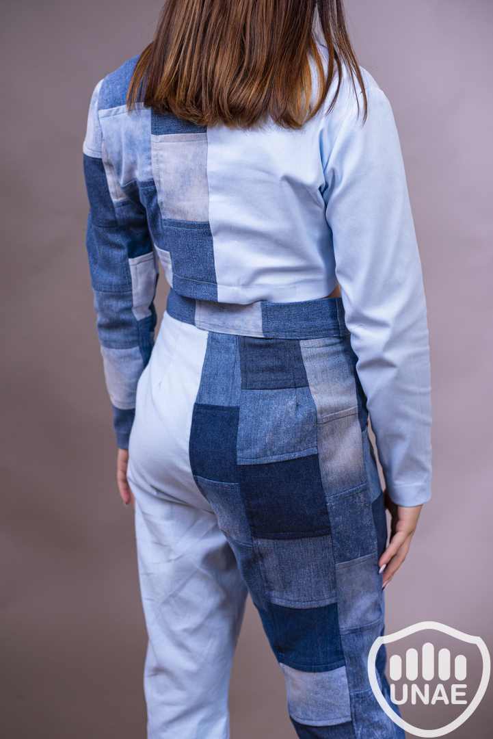 Confeccionado por un lado de tela de jeans en desuso y por gabardina, cortando en pedazos y uniendo los jeans formamos un tejido único con el cual podemos realizar muchos diseños para poder incentivar y concienciar a la gente acerca de la moda sostenible y así poder marcar tendencia como moda sostenible.
