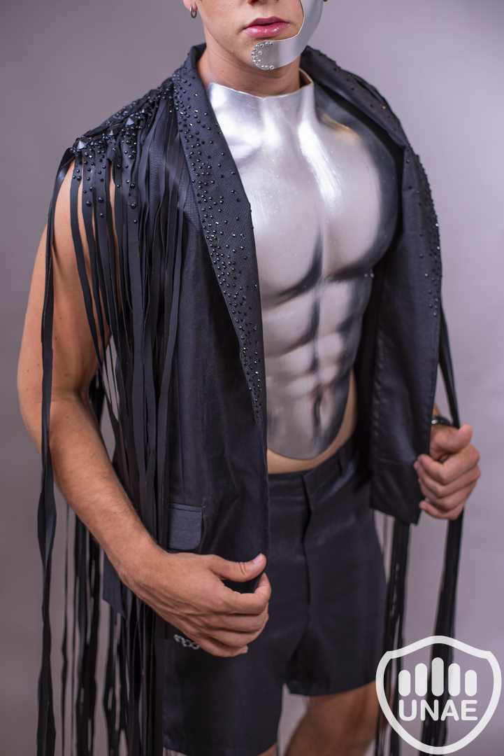 Transformación de un tapado masculino convirtiendo a un saco sin manga con cuello smoking y corte cazador dándole así un estilo Sport elegante con flecos de eco cuero que le dan un toque vanguardista, acompañado con un short convertido del mismo saco completando look con unas botas tipo borcego con detalles de cuerina.