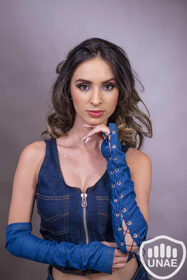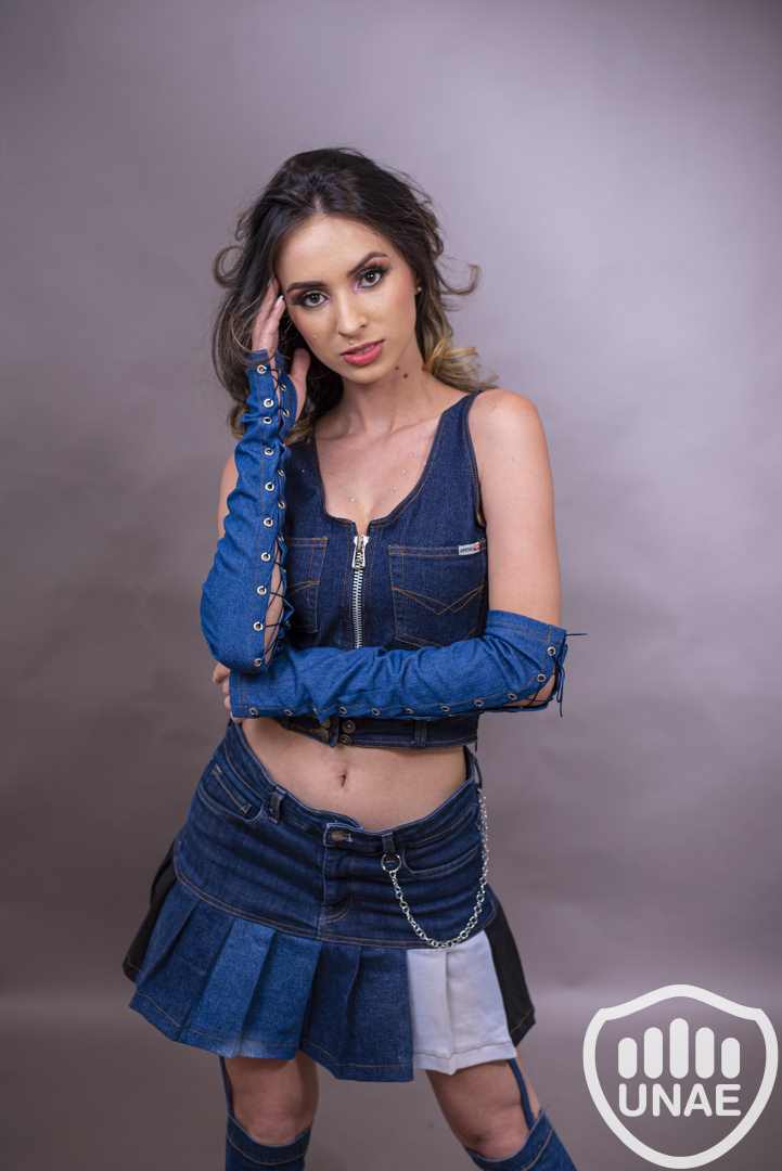 Esta creación es de un estilo neoyorquino y comprende varios elementos a especificar que son los guantes, tirantes y medias de denim creando así un conjunto completo en inspiración a la mujer libre, segura de sí misma y fuerte ante el mundo.