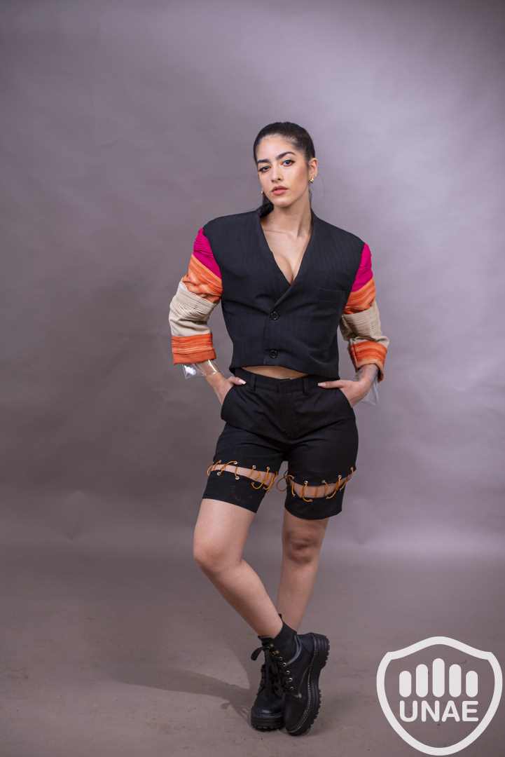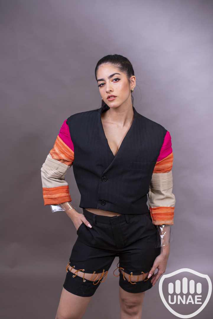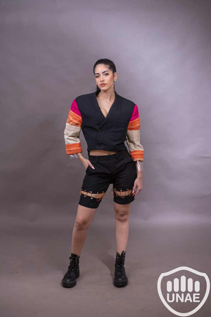 Para la parte inferior se utilizó un pantalón de vestir que posteriormente paso a ser una bermuda, la cual cuenta con detalles de ojalillos a través de los cuales pasan cables pintados de color naranja.