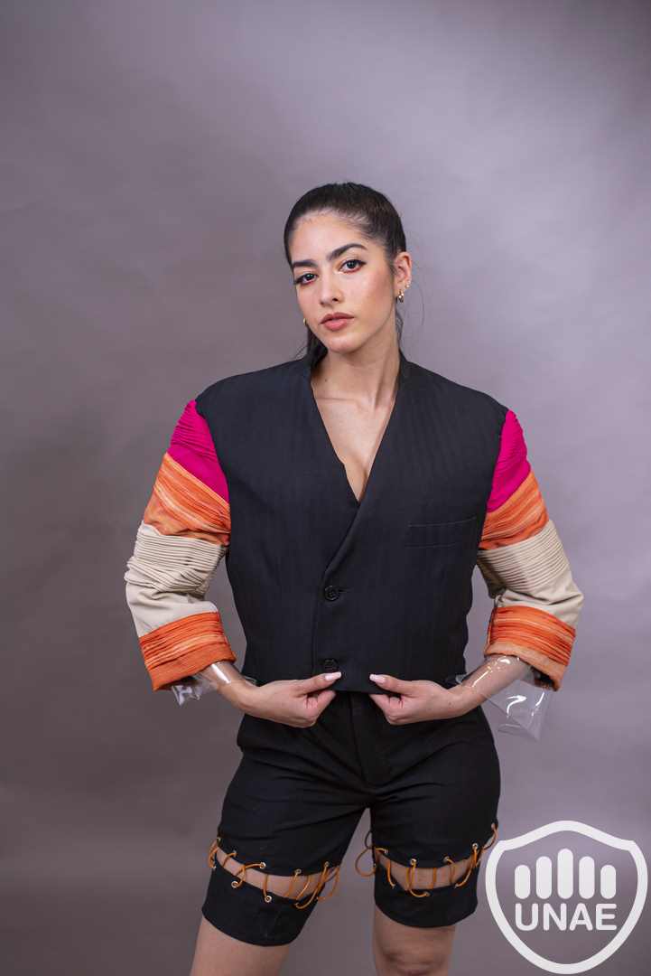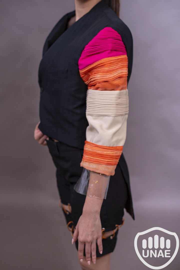 Para la parte superior se utilizó un saco sastre como base, el cual sufrió varias intervenciones, tanto en el largor, en la solapa y en las mangas. En las mangas se confeccionó alforzas, haciendo alusión a las grietas que se forman en la tierra. Las alforzas están hechas con prendas que ya estaban en desuso como una camisa (naranja) y una pollera (beige), así como también retazos de tejido sobrantes. El puño del saco cuenta con pvc reciclado, el cual hace referencia al agua.