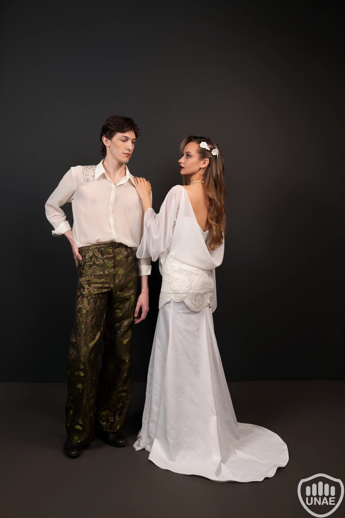El diseño masculino representa a un hombre moderno atravesado por una ausencia que no logra comprender. No recuerda a su amada ni la vida que compartieron, pero conserva una melancolía persistente y la intuición de que una presencia lo acompaña. Este sentimiento se refleja en un pantalón wide leg de tiro alto, confeccionado en un textil tipo brocado verde oliva con reflejos dorado envejecido, que aporta profundidad y una estética atemporal. La camisa holgada de gasa semitranslúcida incorpora el simbolismo principal: manos bordadas en perlas y canutillos en tonos blancos, transparentes, verdes y negros —este último como símbolo de la muerte—, de cuyas muñecas descienden collares de perlas hacia la espalda, representando el lazo espiritual de su amada. Completa el conjunto un antifaz de gasa negra bordada, metáfora del luto sin memoria y del amor que siente sin recordar.