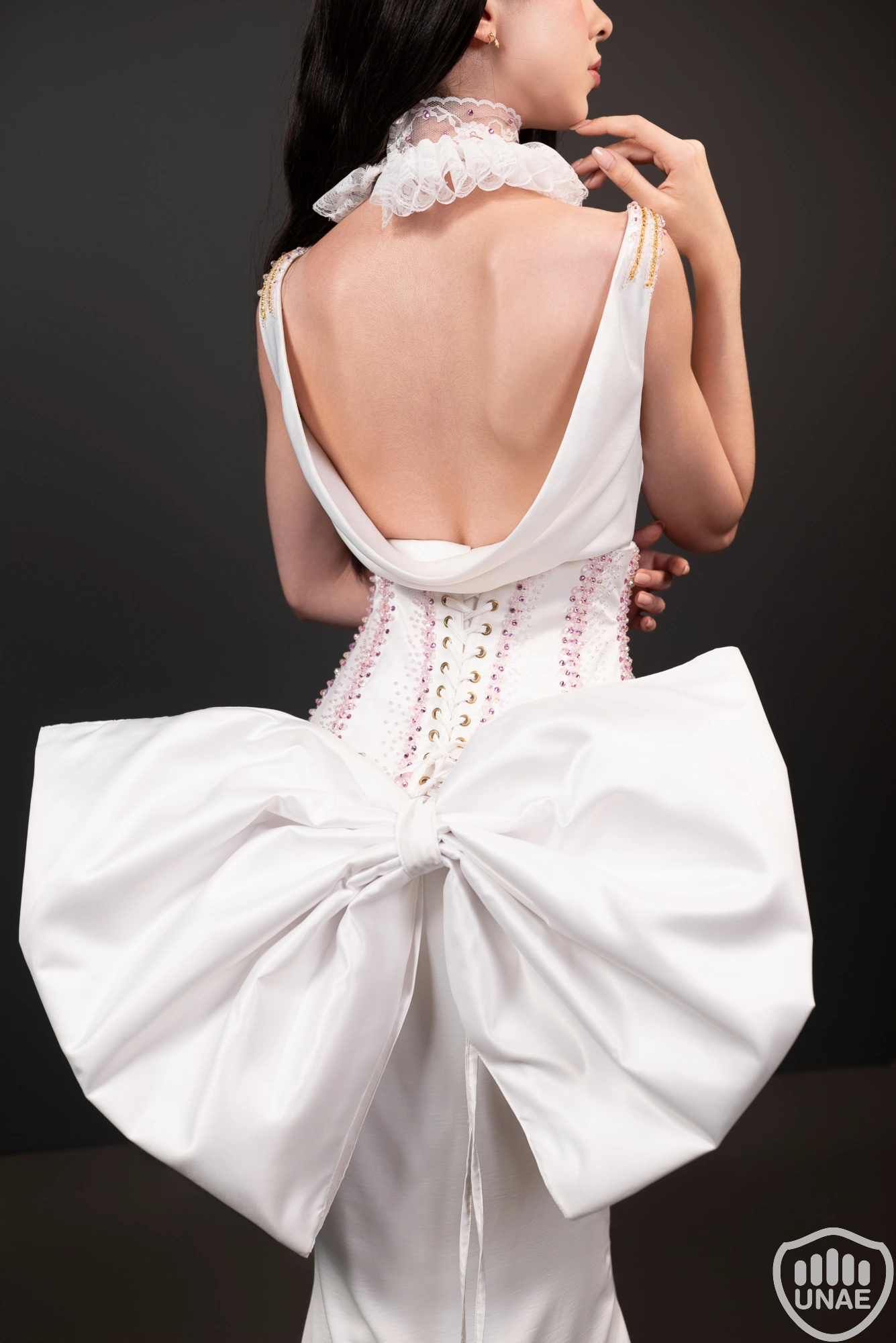 El diseño femenino, inspirado en Colombina, expresa sensualidad, belleza y libertad. El vestido de satén blanco con caída en el cuello y la espalda revela elegancia y movimiento, adornado con bordados rosados y dorados que representan deseo y sofisticación. Un corset con los mismos detalles, junto a un moño estructurado con intervención textil inspirada en el Palacio Ducal, acentúan su encanto seductor. La máscara blanca con velo transparente completa su aire de misterio y poder.