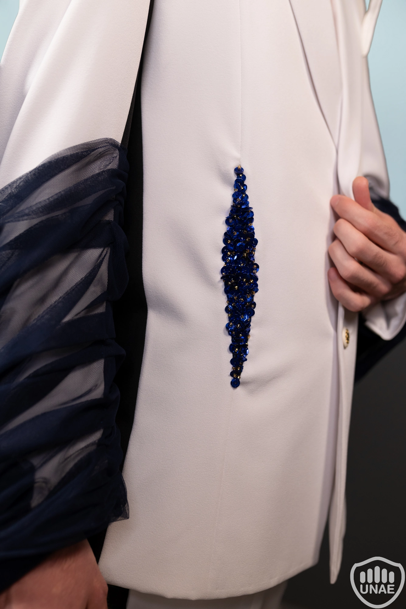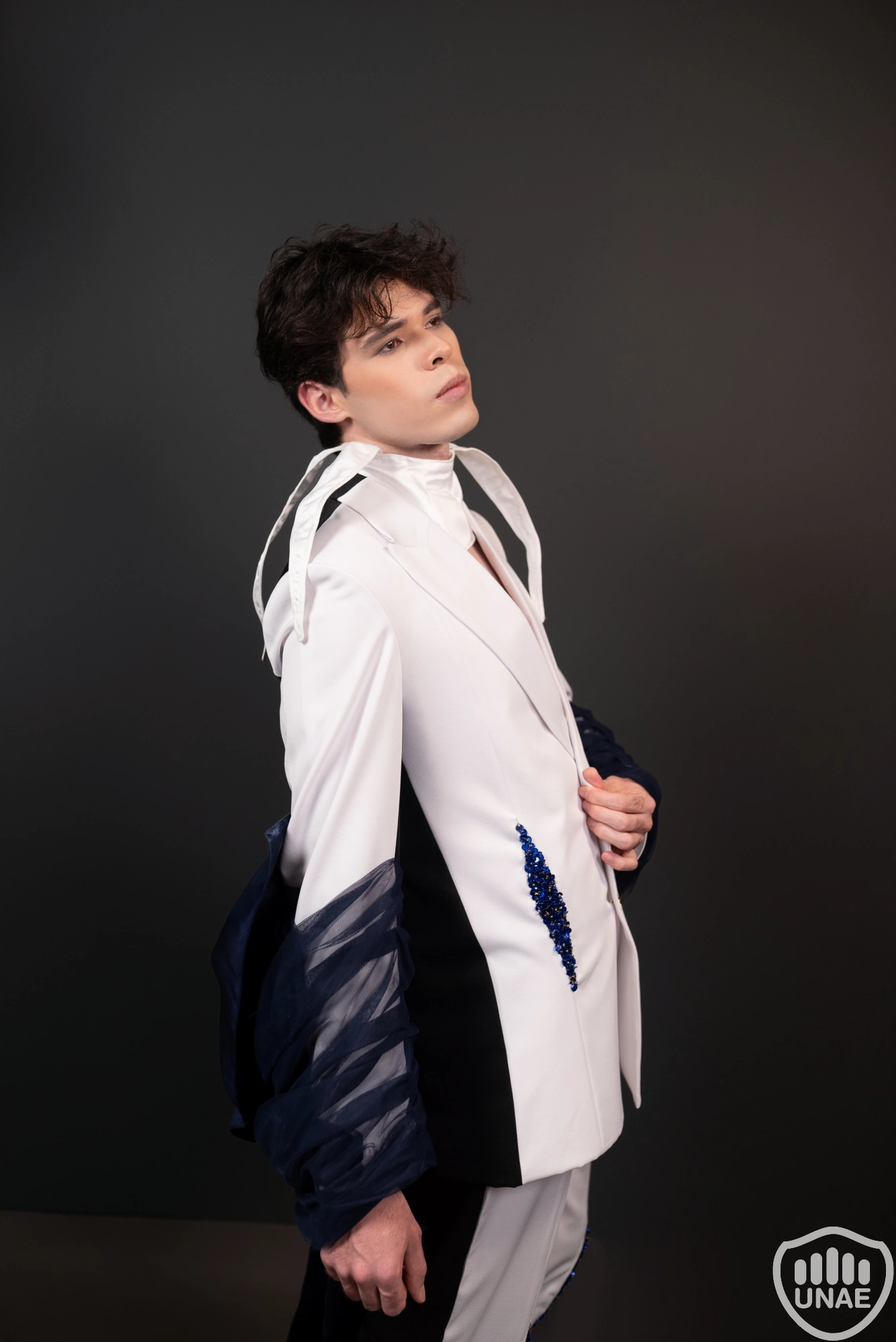 El diseño masculino, inspirado en Pierrot, refleja la melancolía del amor no correspondido mediante el contraste entre el blanco y el negro, simbolizando la lucha entre la pureza y la oscuridad interior. Los bordados en tonos azules y dorados evocan tristeza y nobleza, mientras un moño azul cubierto por una tela negra transparente cae desde la espalda, sugiriendo la sensación de estar atrapado en sus sentimientos. Su presencia encarna la vulnerabilidad y la profundidad emocional.