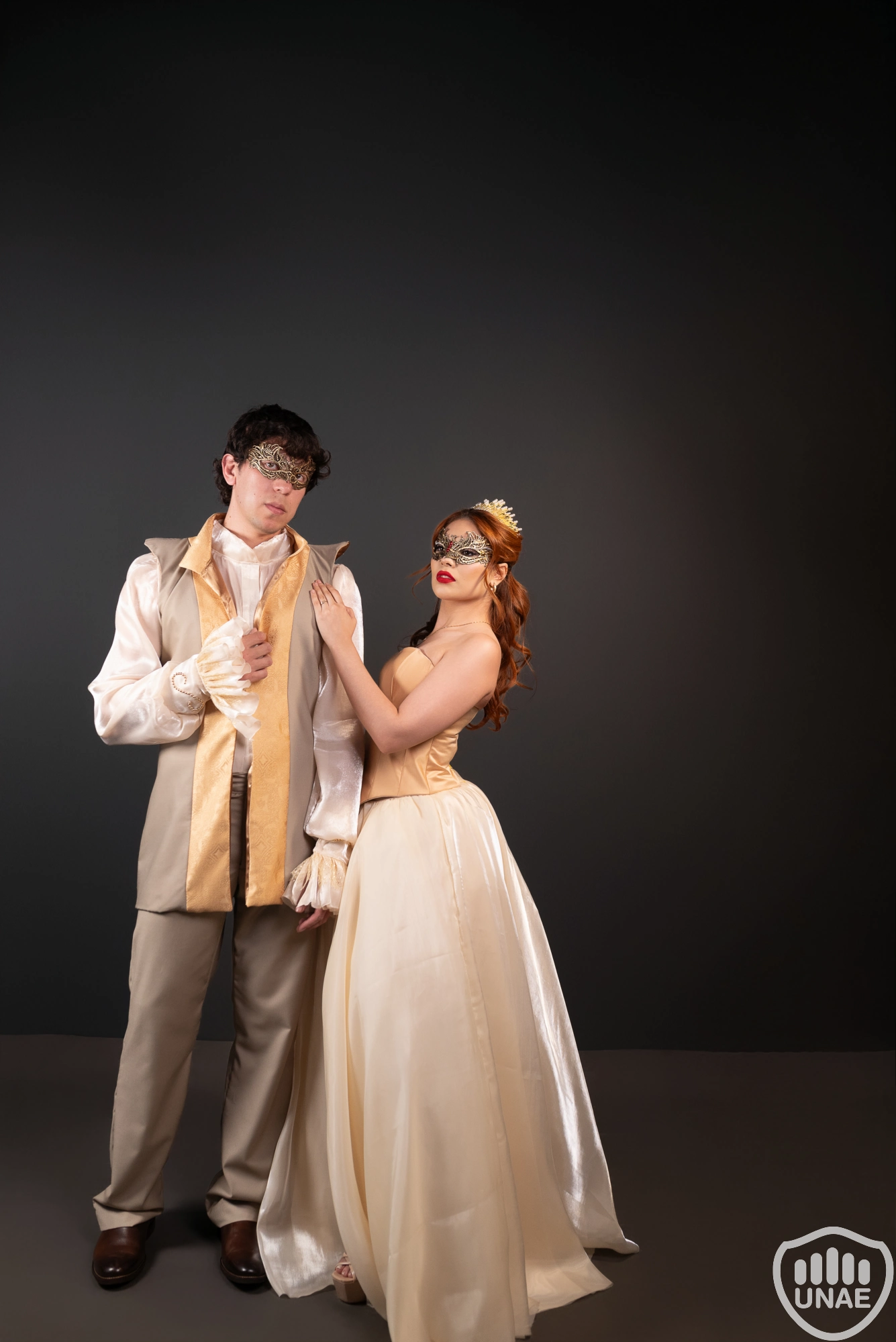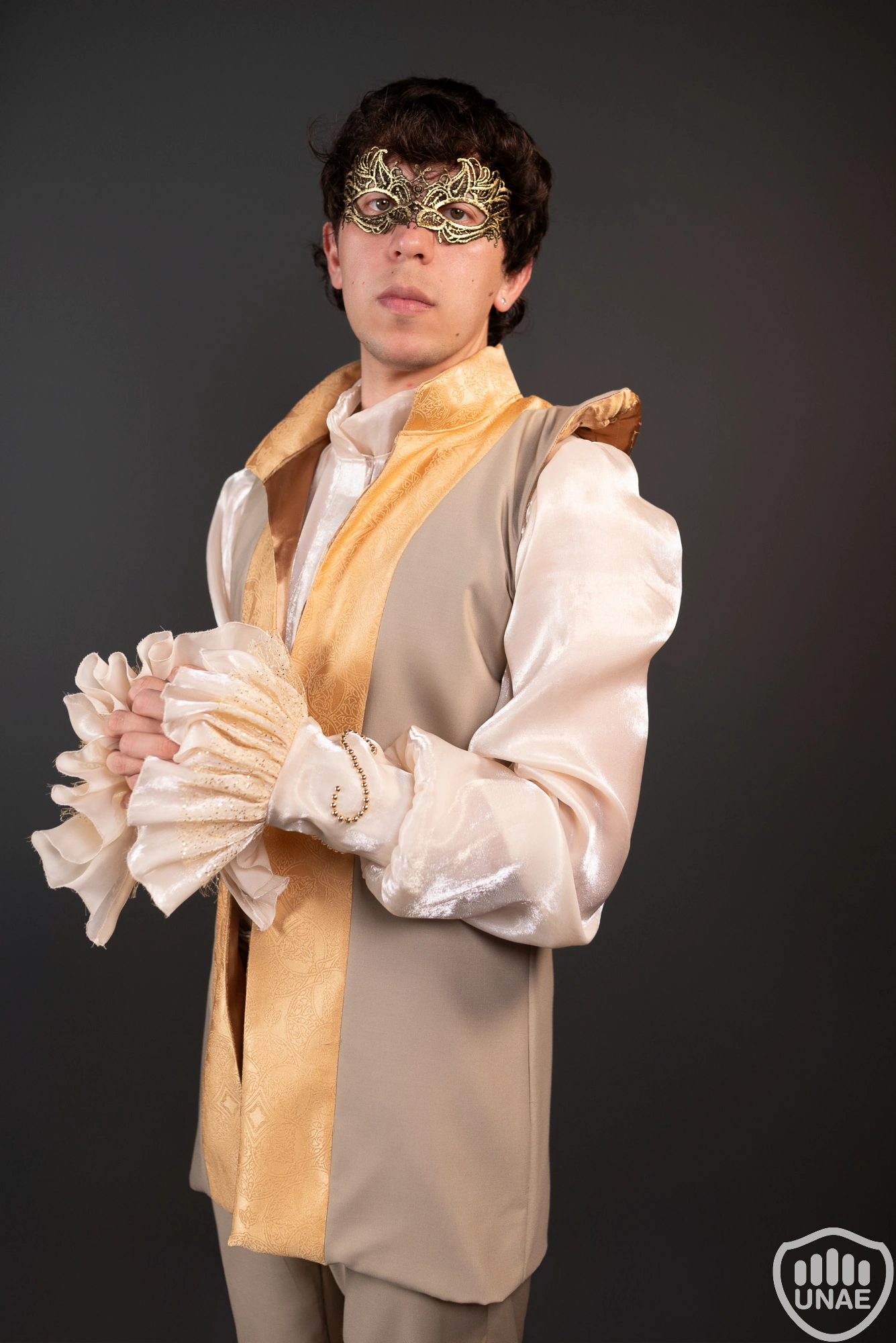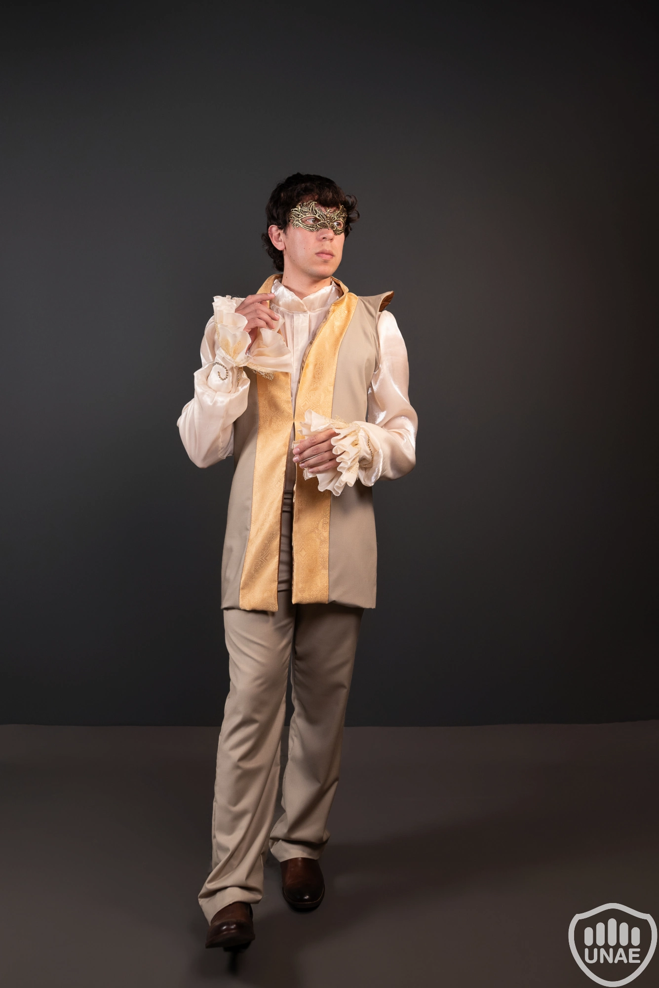 El look se completa con una máscara ornamental dorada, que refuerza la referencia al carnaval veneciano y aporta un toque de misterio y sofisticación. El resultado final es un atuendo elegante, teatral y armónico, ideal para desfiles, representaciones temáticas o eventos inspirados en la moda histórica con una mirada moderna.