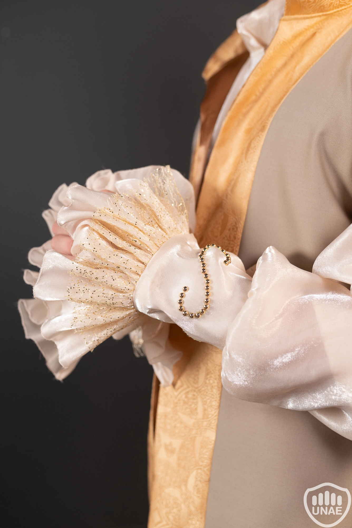 El chaleco es la pieza central del conjunto. Realizado en una base beige neutra, incorpora una franja frontal en tono dorado con un leve diseño jacquard que aporta riqueza visual sin exageración. La estructura del chaleco presenta un cuello alto rígido y hombros ligeramente realzados, lo que otorga porte, verticalidad y una presencia escénica marcada. Su diseño se abre ligeramente en la parte inferior, permitiendo que la prenda acompañe el cuerpo sin restringir el movimiento.