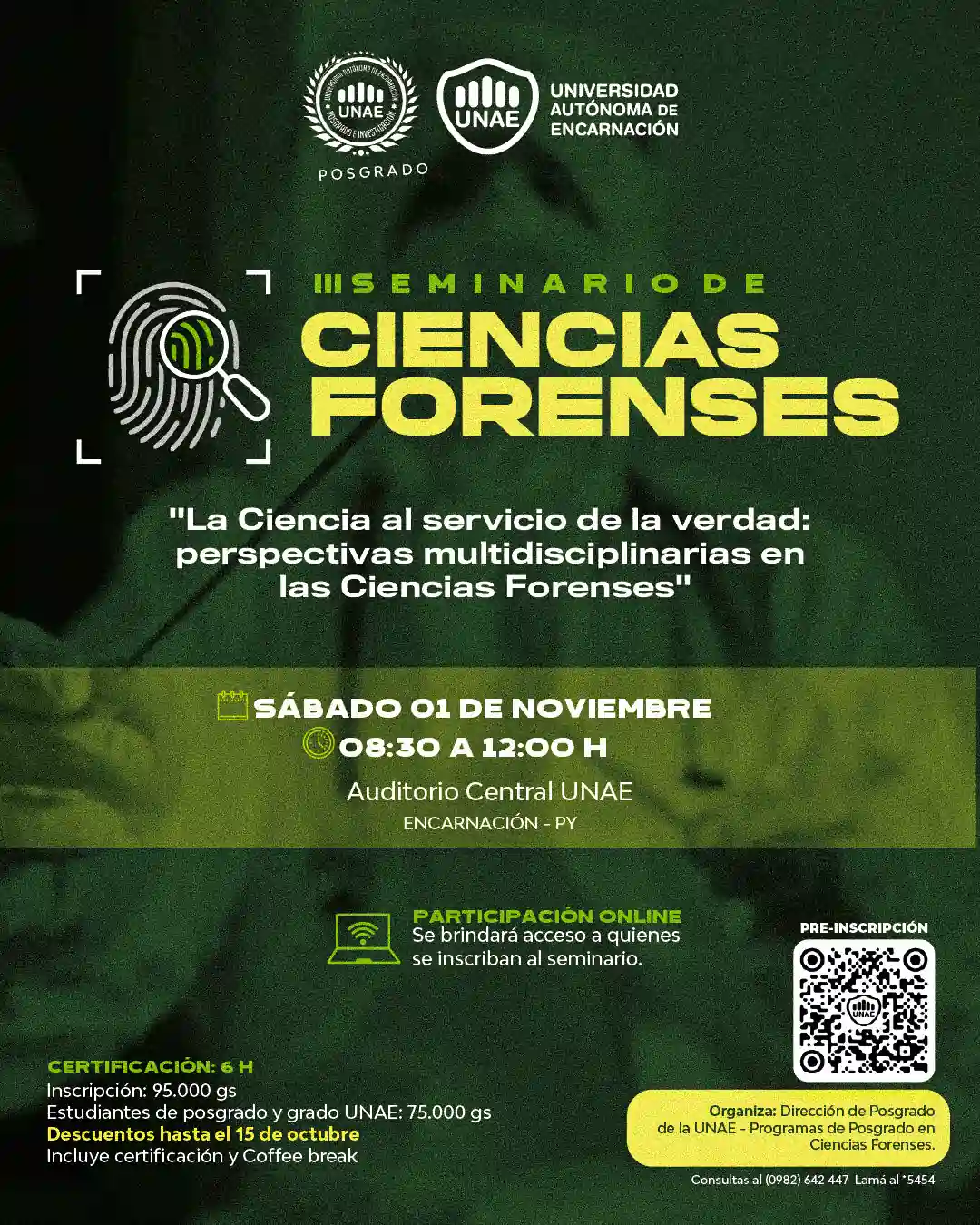 La Universidad Autónoma de Encarnación (UNAE) invita a participar del III Seminario de Ciencias Forenses, bajo el lema: "La Ciencia al servicio de la verdad: perspectivas multidisciplinarias en las Ciencias Forenses".