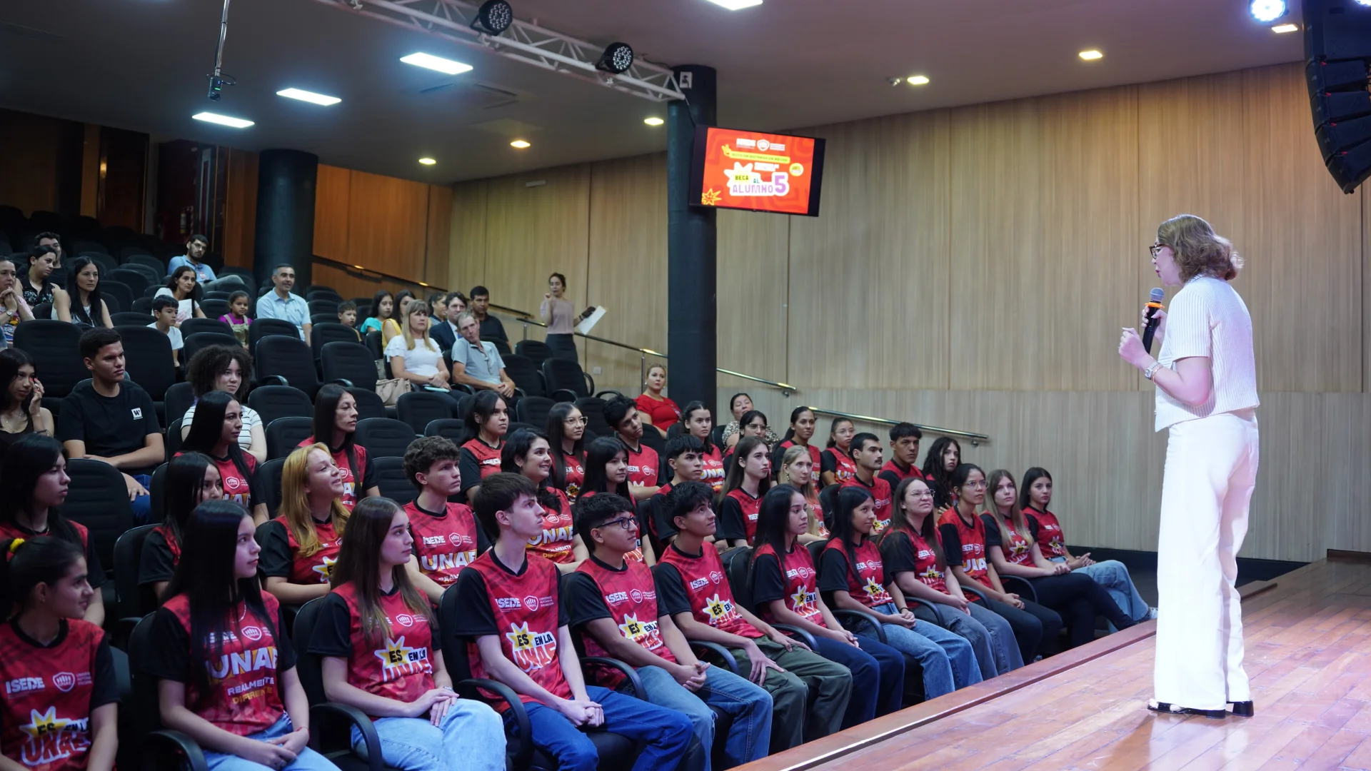 El acto se realizó el martes 17 de febrero en el auditorio central de la Universidad Autónoma de Encarnación y contó con la participación de numerosas familias de los estudiantes beneficiados. Fue presidido por la rectora, doctora Nadia Czeraniuk, quien dirigió las palabras centrales y se refirió al valor de la oportunidad educativa y al compromiso social de la universidad. Explicó que el programa no se limita a la exoneración de aranceles, sino que contempla también la participación de los becarios en actividades formativas en investigación y en prácticas laborales como parte de su proceso de formación.