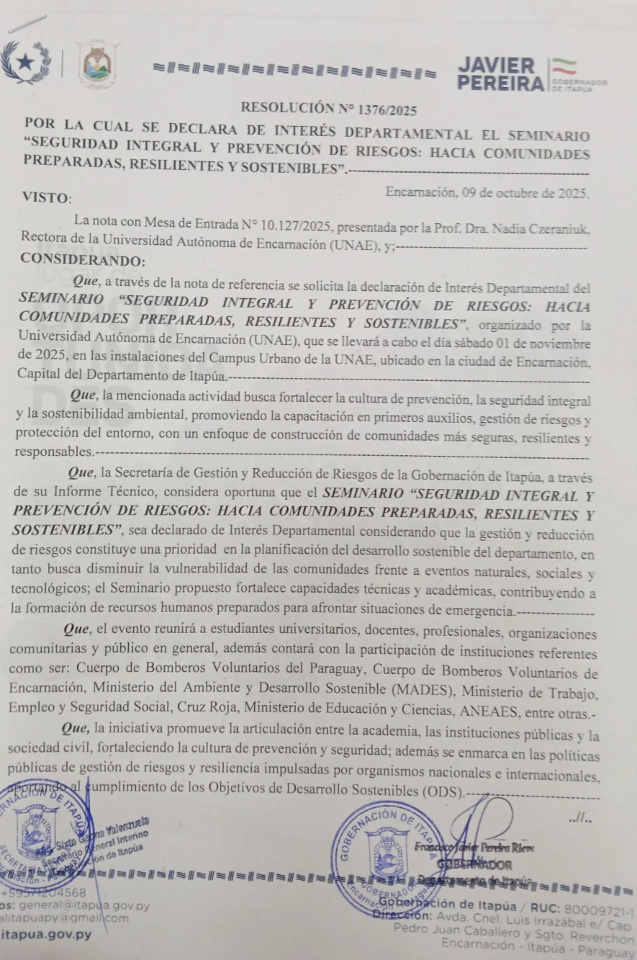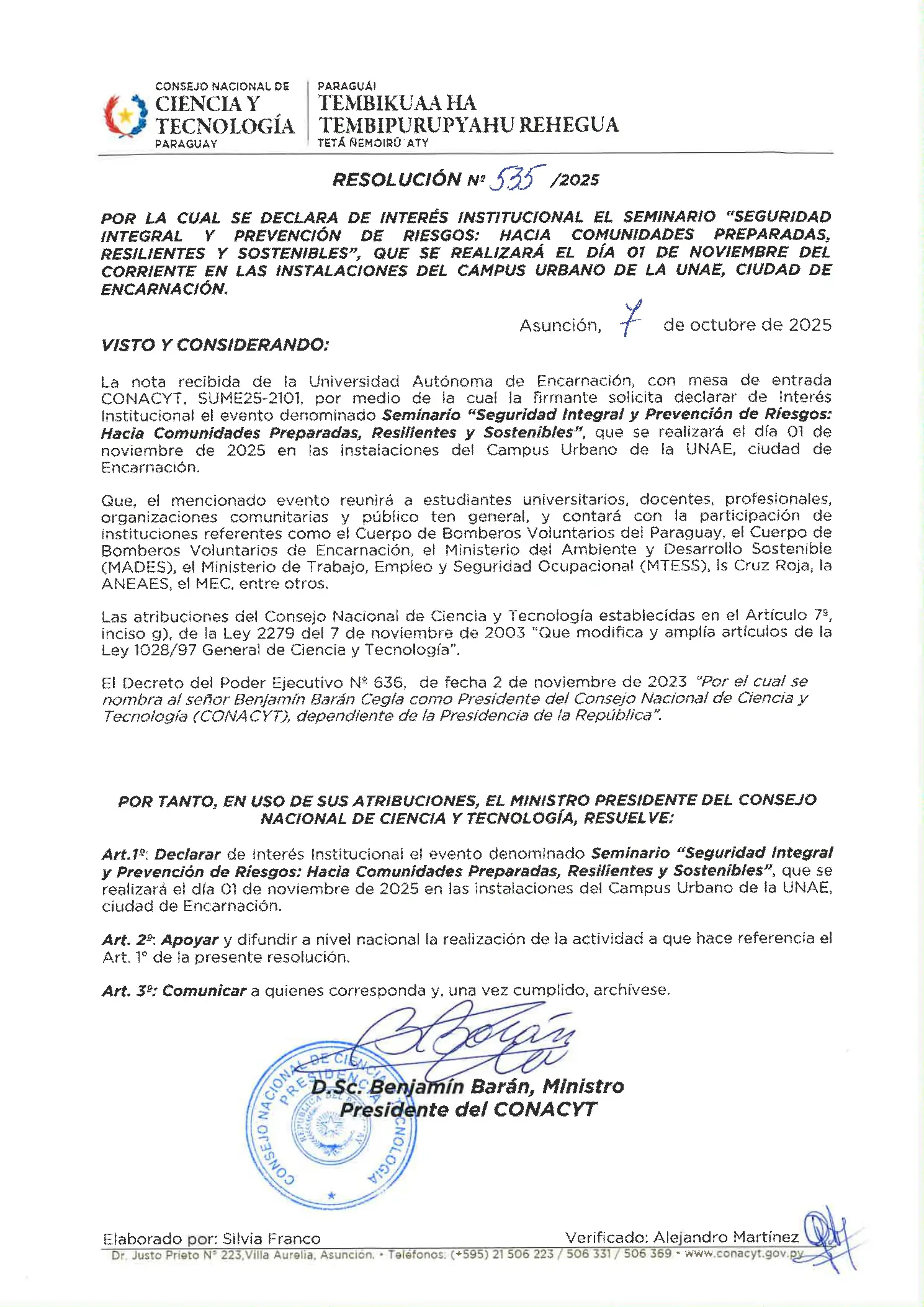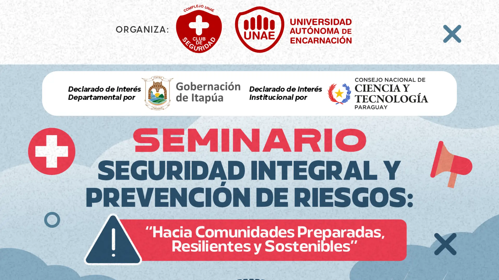 El I Seminario de Seguridad Integral y Prevención de Riesgos “Hacia Comunidades Preparadas, Resilientes y Sostenibles” ha sido declarado de Interés Institucional por el Consejo Nacional de Ciencia y Tecnología (CONACYT) y de Interés Departamental por la Gobernación de Itapúa, destacando la relevancia del evento en la promoción de una cultura de prevención y resiliencia en la comunidad.