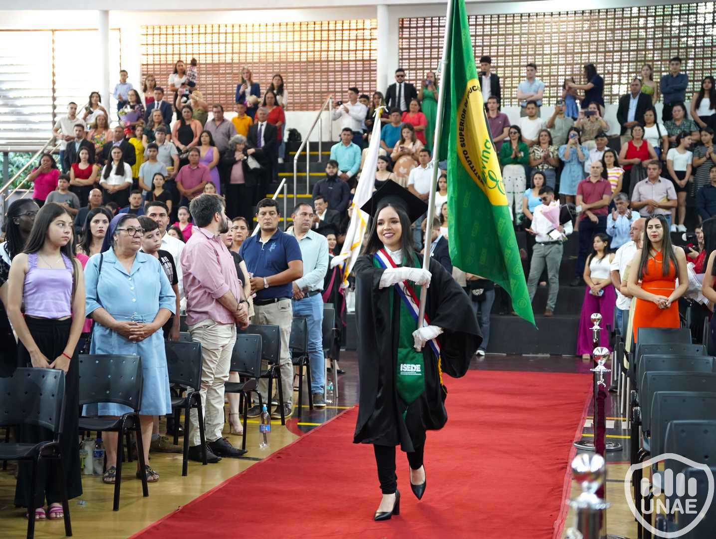 El momento más esperado fue el ingreso de los egresados, quienes, acompañados por sus padrinos, recibieron calurosos aplausos mientras desfilaban orgullosamente representando a sus respectivas facultades e instituto.