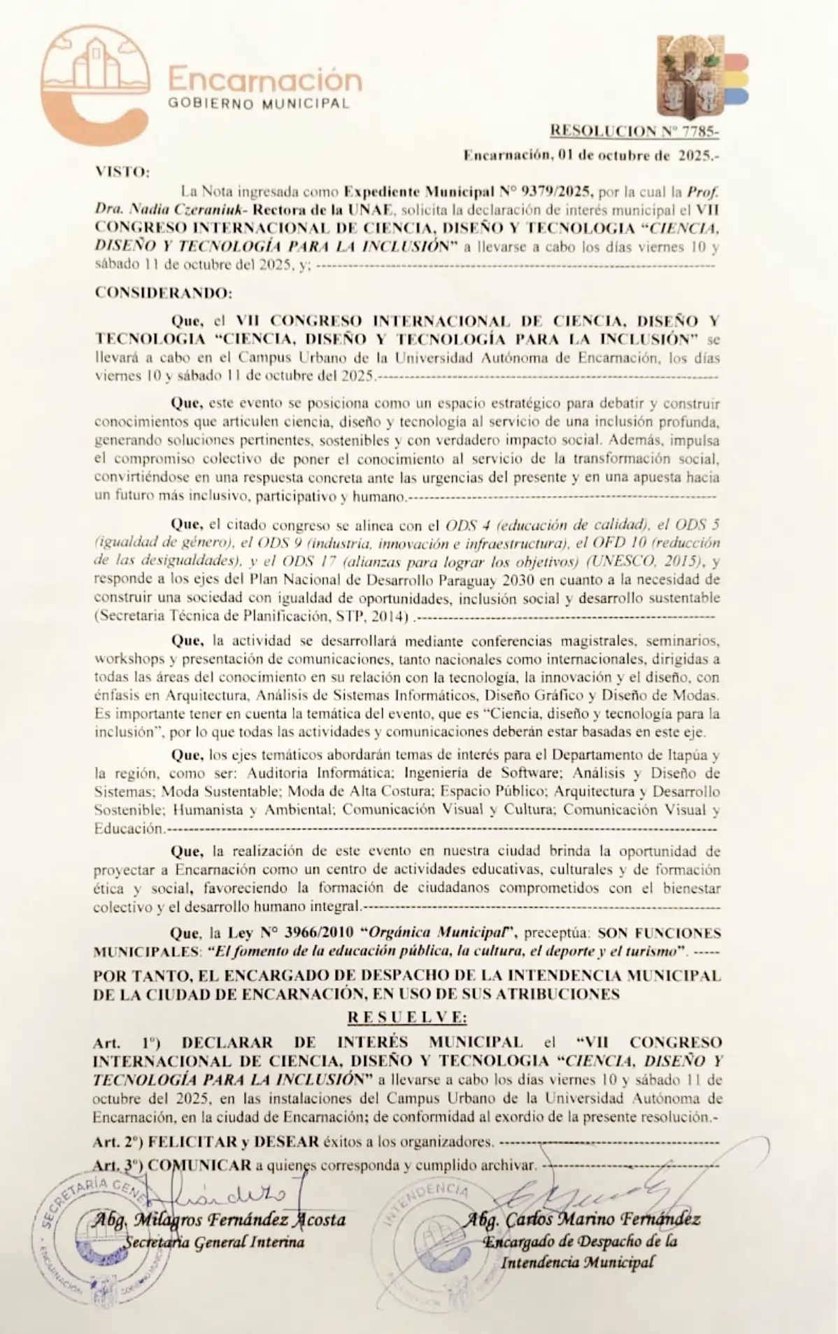 El VII Congreso Internacional de Ciencia, Diseño y Tecnología con el lema “Ciencia, diseño y tecnología para la inclusión” fue declarado de interés municipal por la Municipalidad de Encarnación por Res. N° 7785/2025.