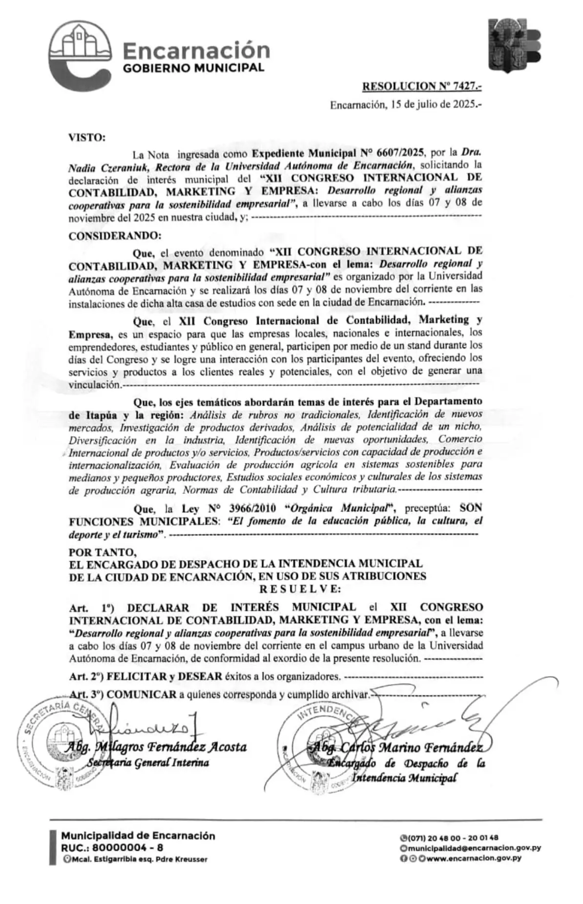 El XII Congreso Internacional de Contabilidad, Marketing y Empresa con el "Desarrollo regional y alianzas cooperativas para la sostenibilidad empresarial" ha sido declarado de interés Municipal por la Municipalidad de la ciudad de Encarnación por Res. N° 7427.