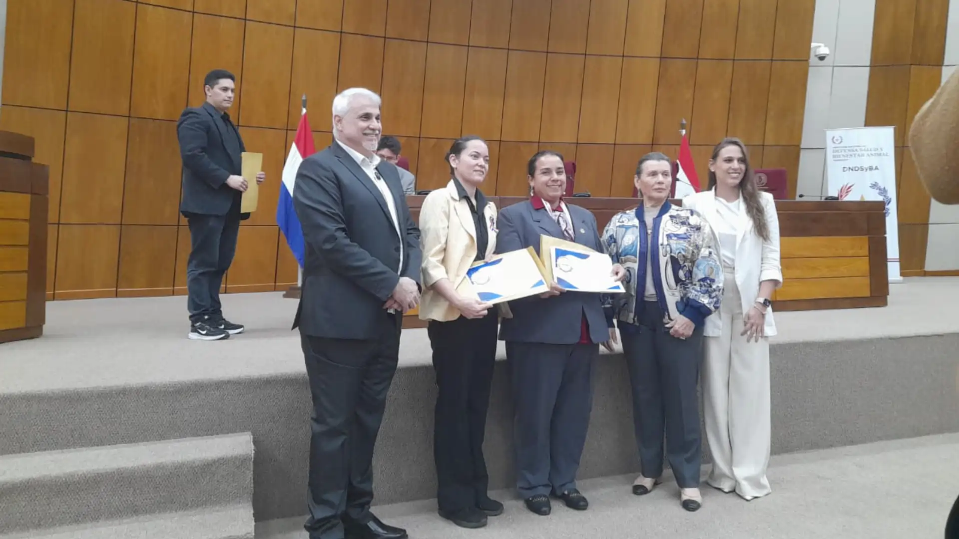 En representación de la Clínica Universitaria Interdisciplinaria de Animales (CUIDA) de la Universidad Autónoma de Encarnación – UNAE, asistieron la Mgter. Dra. Karen Aguirre, Directora de la Carrera de Medicina Veterinaria, y la estudiante Cecilia Kanazawa, quienes recibieron los reconocimientos en nombre de la institución.