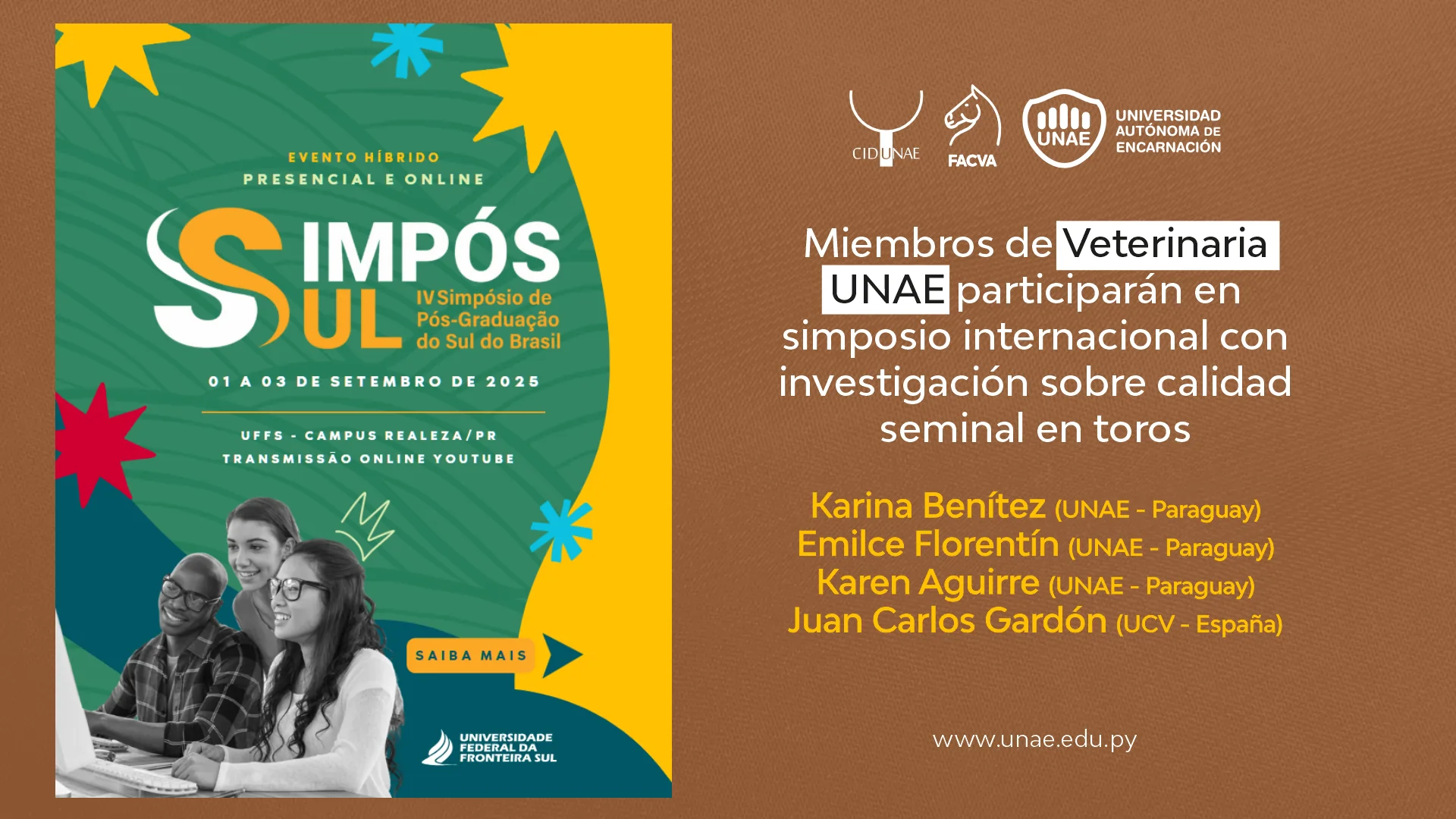 Un equipo académico de la carrera de Veterinaria de la Universidad Autónoma de Encarnación (UNAE) fue seleccionado para participar en el IV Simposio de Posgraduación "SimpoSul", organizado por la Universidade Federal da Fronteira Sul (Brasil), tras la aprobación de su propuesta por parte del Comité Científico del evento.
