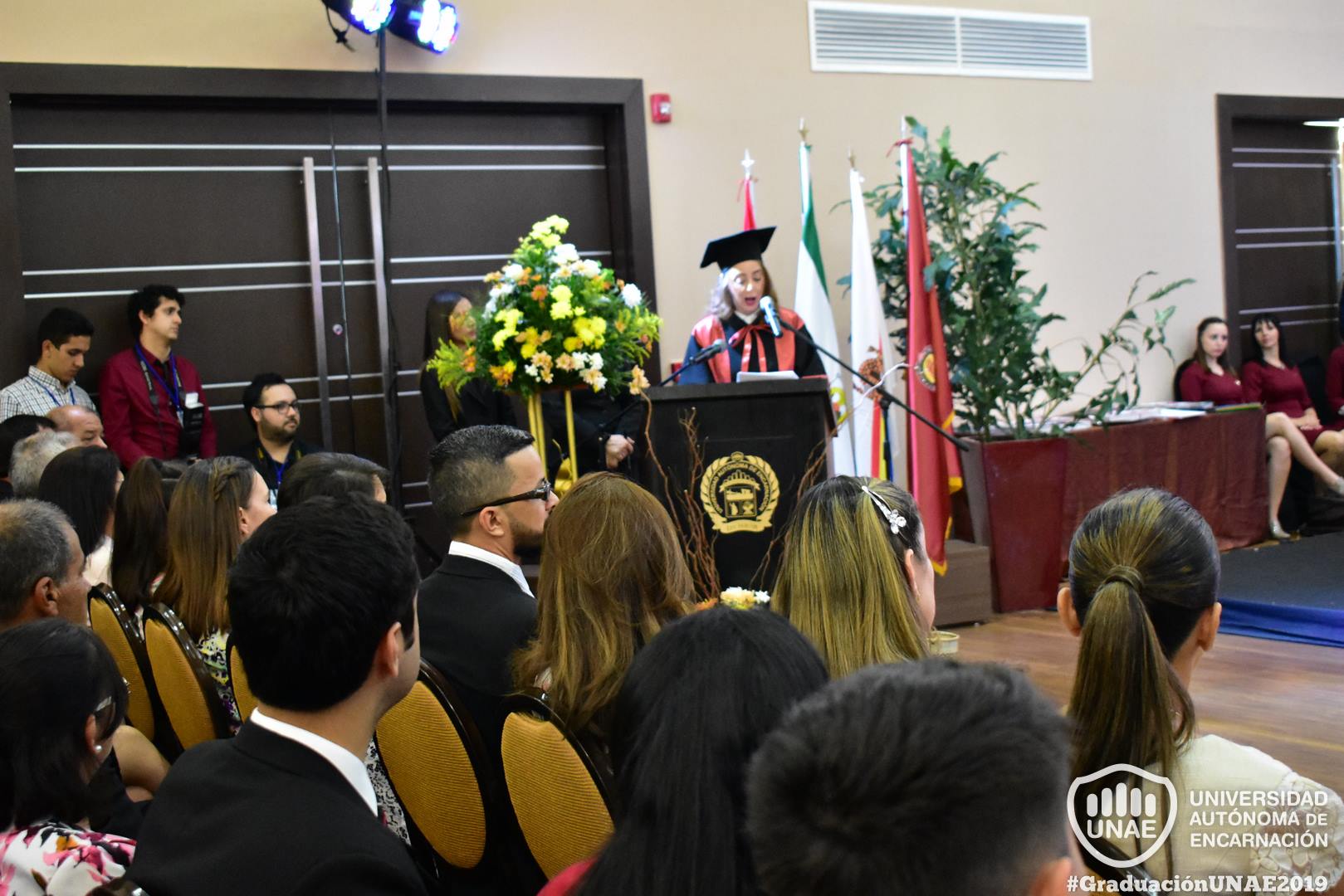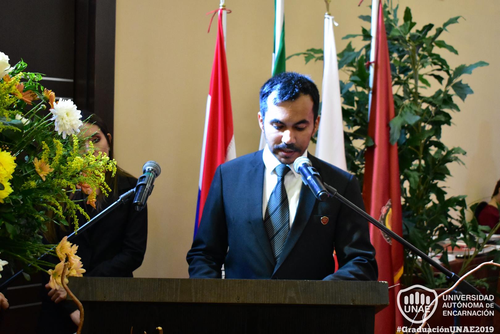 Los discursos de los graduados estuvieron a cargo de Mirtha Lébedich (Mejor egresada de la carrera de Psicopedagía) y Natalia Enciso (Mejor Egresada de Administración de Empresas).
