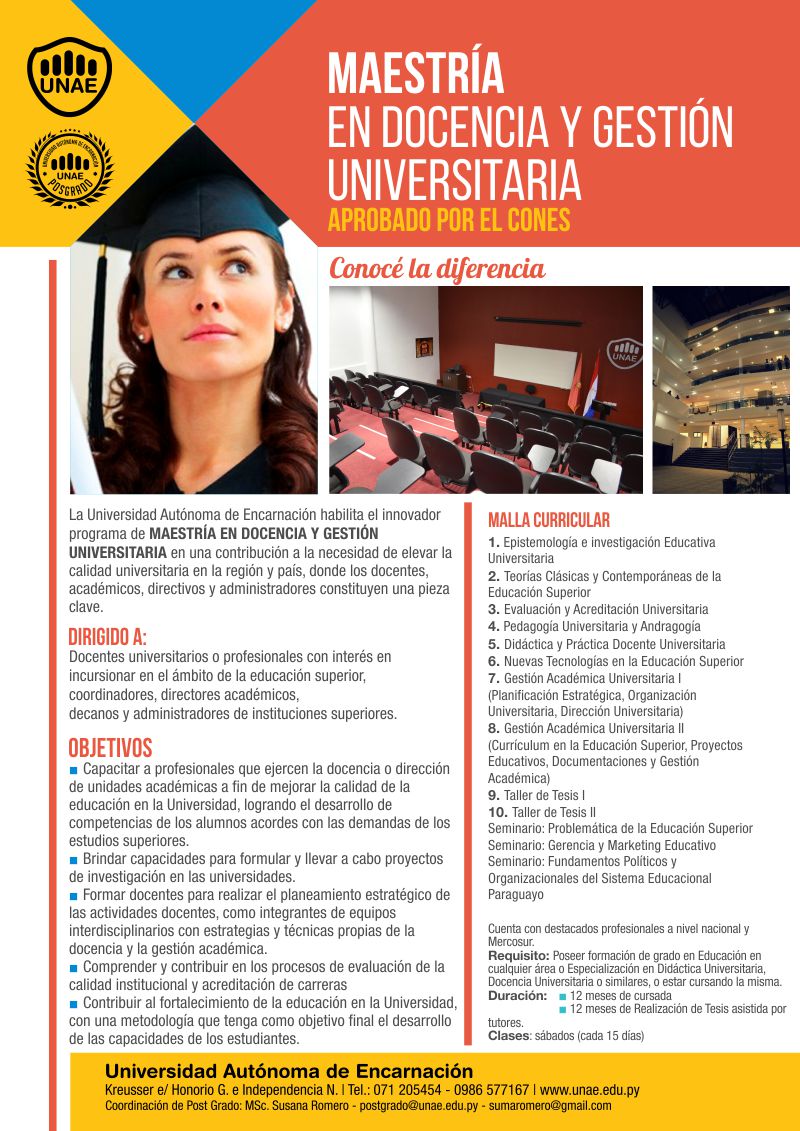 La Universidad Autónoma de Encarnación habilita el innovador programa de MAESTRÍA EN DOCENCIA Y GESTIÓN UNIVERSITARIA en una contribución a la necesidad de elevar la calidad universitaria en la región y país, donde los docentes, académicos, directivos y administradores constituyen una pieza clave. Cuenta con destacados profesionales a nivel nacional y Mercosur.