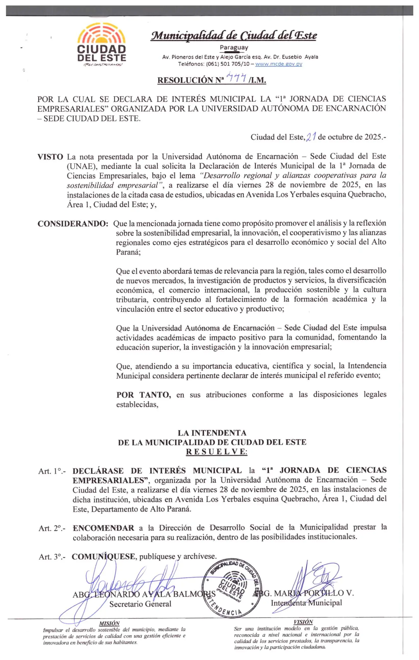 La 1ª Jornada de Ciencias Empresariales “Desarrollo regional y alianzas cooperativas para la sostenibilidad empresarial”, fue declarada de Interés Municipal por la Municipalidad de Ciudad del Este por Res. N° 323/2025.