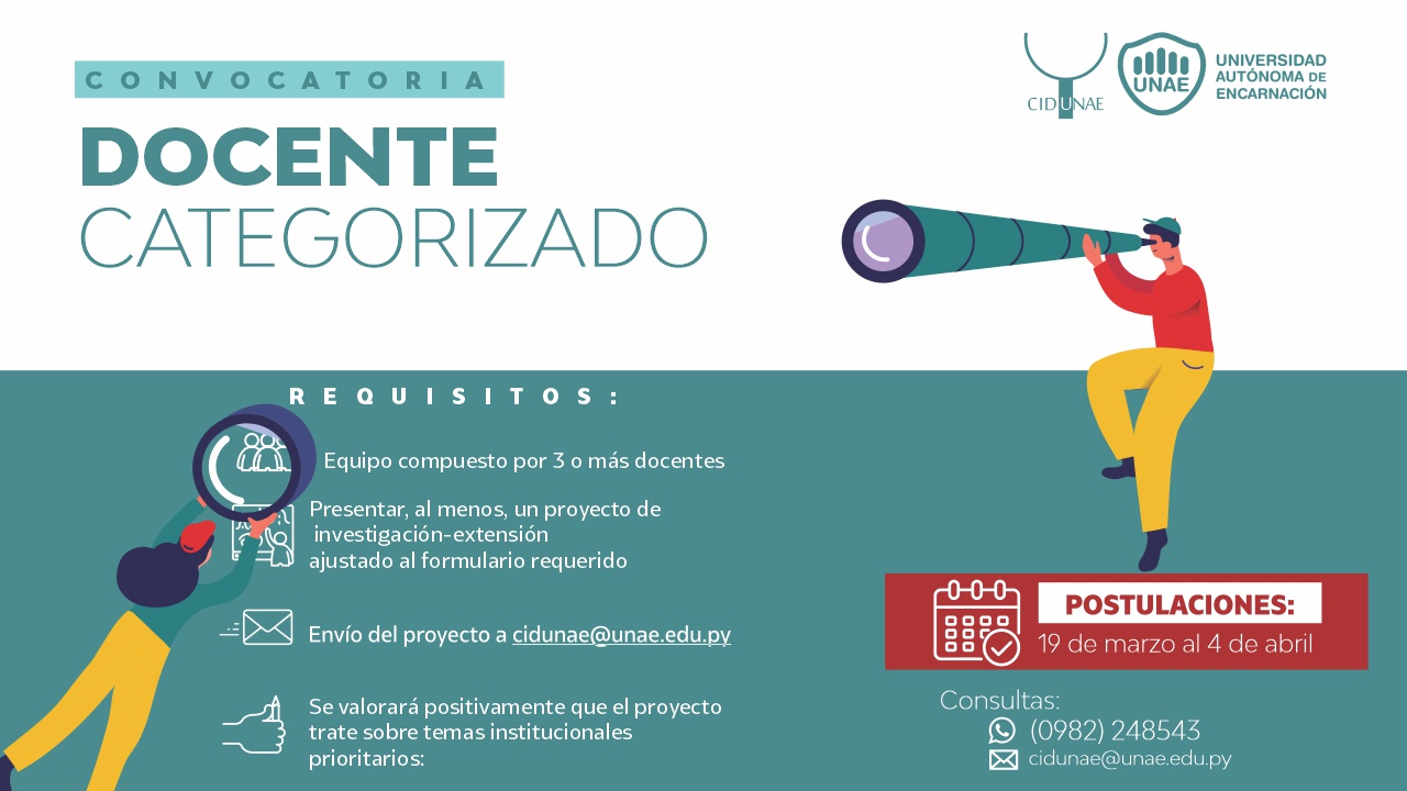 Esta convocatoria supone un incentivo profesional y económico por medio del desarrollo de un proyecto de investigación y extensión autofinanciado por la Universidad Autónoma de Encarnación (UNAE).