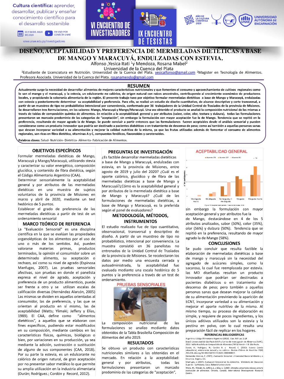 • "Diseño, aceptabilidad y preferencia de mermeladas dietéticas a base de Mango y Maracuyá, endulzadas con estevia como edulcorante no calórico", por Alfonso Yesica Itati y Mendoza Mabel Rosana (Universidad de la Cuenca del Plata).