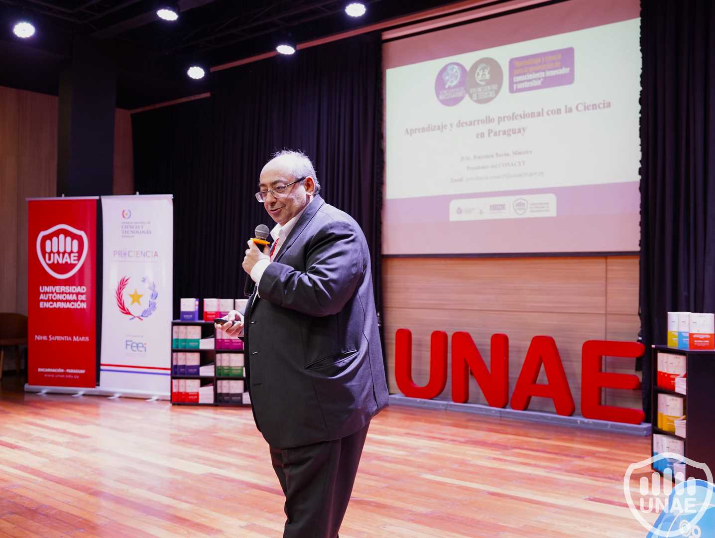 Por lo que respecta a la conferencia magistral, el Dr. Benjamín Barán, Ministro-Presidente del Consejo Nacional de Ciencia y Tecnología (CONACYT), desarrolló la conferencia “Aprendizaje y desarrollo profesional con la Ciencia en Paraguay”, enfatizando las oportunidades de crecimiento profesional y personal que el CONACYT tiene a disposición para investigadores en formación, investigadores científicos e innovadores.