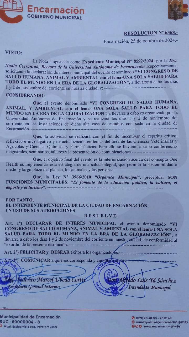 VI Congreso de Salud Humana, Animal y Ambiental es declarado de interés municipal por la Municipalidad de Encarnación