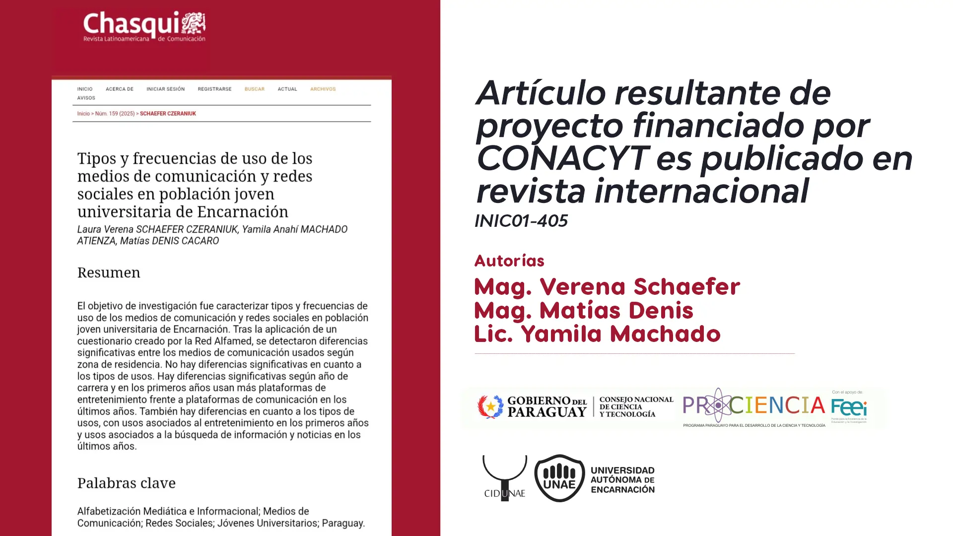 Este martes 7 de octubre a las 11:00 h (Paraguay) se presentarán los principales resultados del artículo, “Tipos y frecuencias de uso de los medios de comunicación y redes sociales en población joven universitaria de Encarnación”, resultante del proyecto con código INIC01-405, titulado “Alfabetización mediática de los adultos jóvenes del Paraguay para la formación de una ciudadanía crítica y el empoderamiento social”, cofinanciado por el CONACYT.