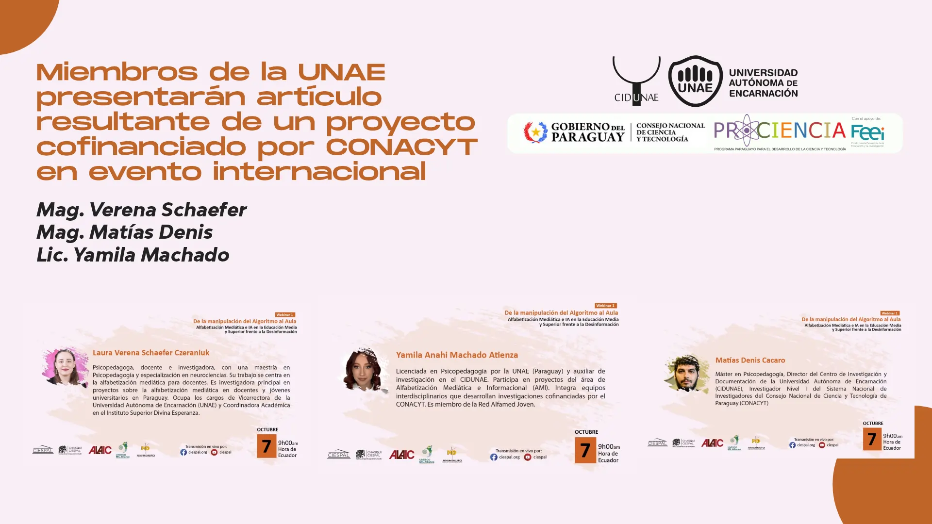 Los avances del proyecto con código PINV01-1354 titulado “Diagnóstico de la alfabetización mediática en docentes de Formación Docente de Paraguay”, cofinanciado por el CONACYT, serán presentados en el XIV Foro de Investigadores de la Universidad Iberoamericana de Paraguay (UNIBE), que se realizará del 20 al 25 de octubre de 2025.